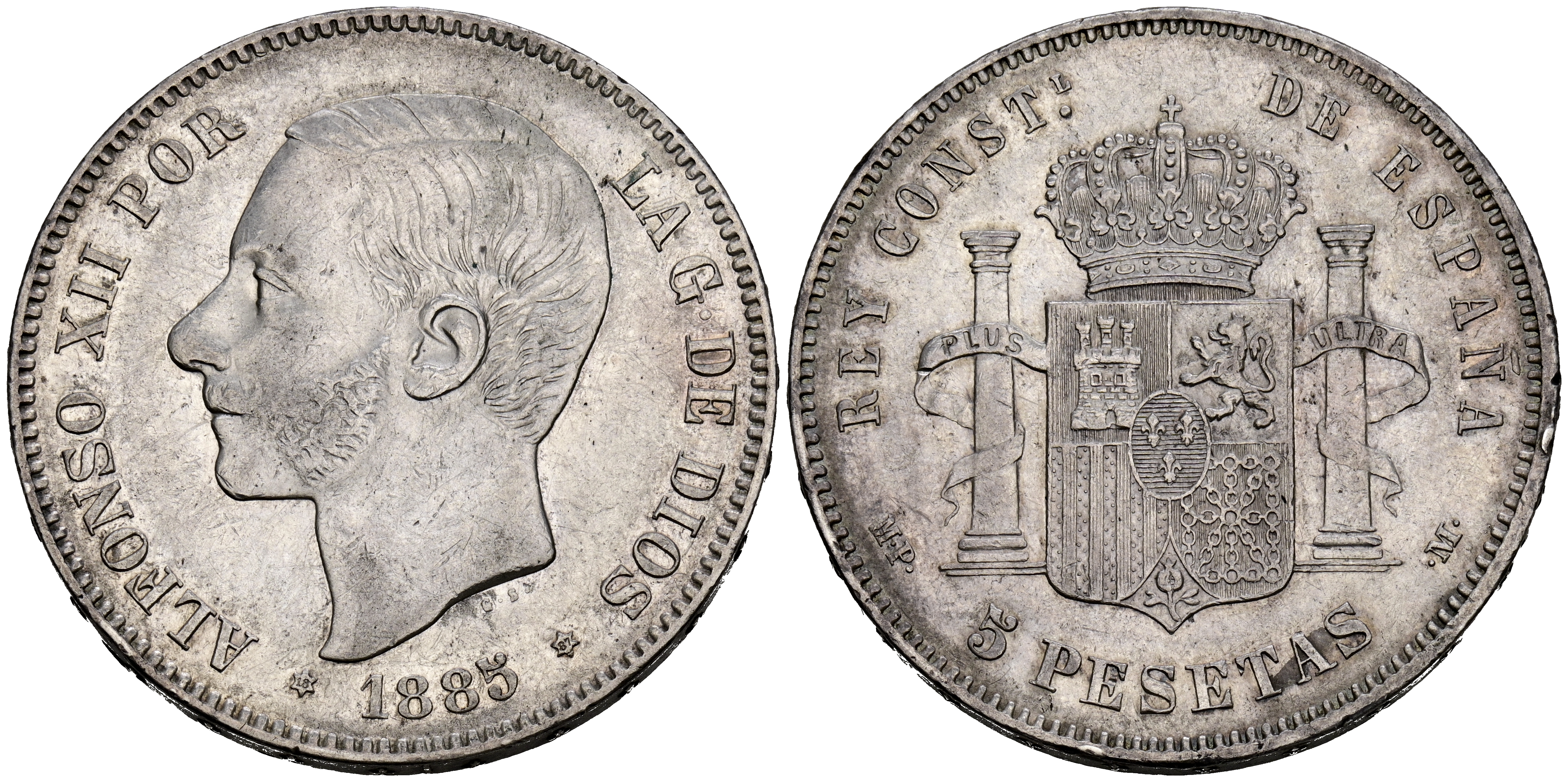 ALFONSO XII (1874-1885). 5 Pesetas. (Ar. 24,91g/38mm). 1885 *18-87. Madrid MPM. (Cal-2019-63). Acuñada bajo el reinado de Alfonso XIII. MBC+. Bonito tono, escasa así.