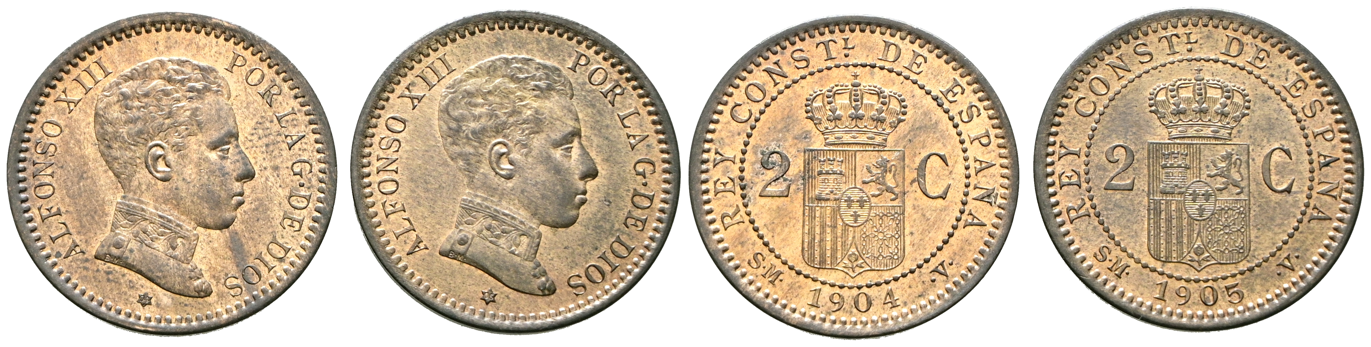 ALFONSO XIII (1885-1931). Pareja de 2 Céntimos de 1904 y 1905. Madrid SMV. Excelente nivel de conservación de ambas piezas. Bonito tono. A EXAMINAR.