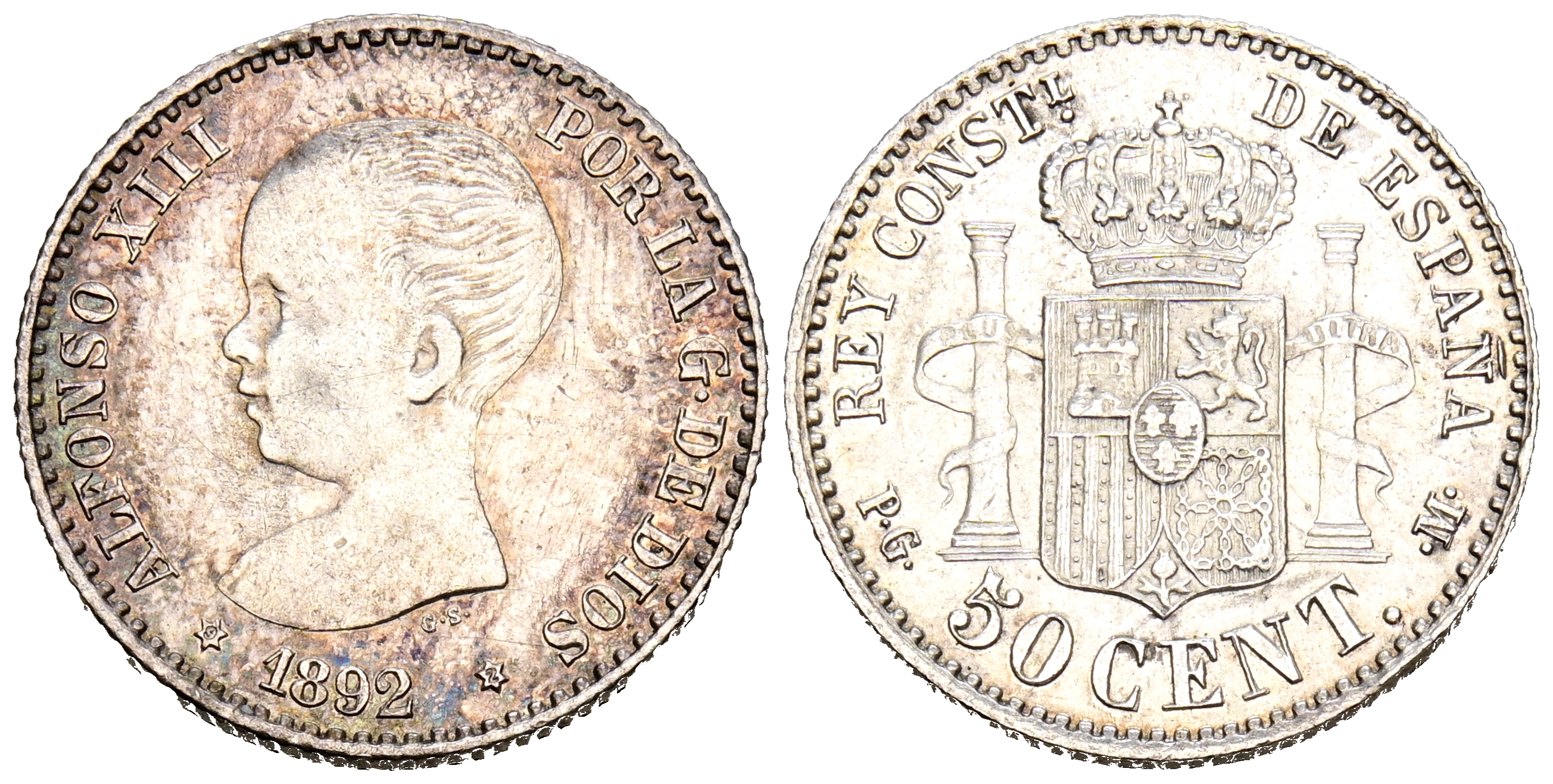 ALFONSO XIII (1885-1931). 50 Céntimos. (Ar. 2,55g/18mm). 1892 *92. Madrid PGM. (Cal-2019-38). MBC+. Pátina.