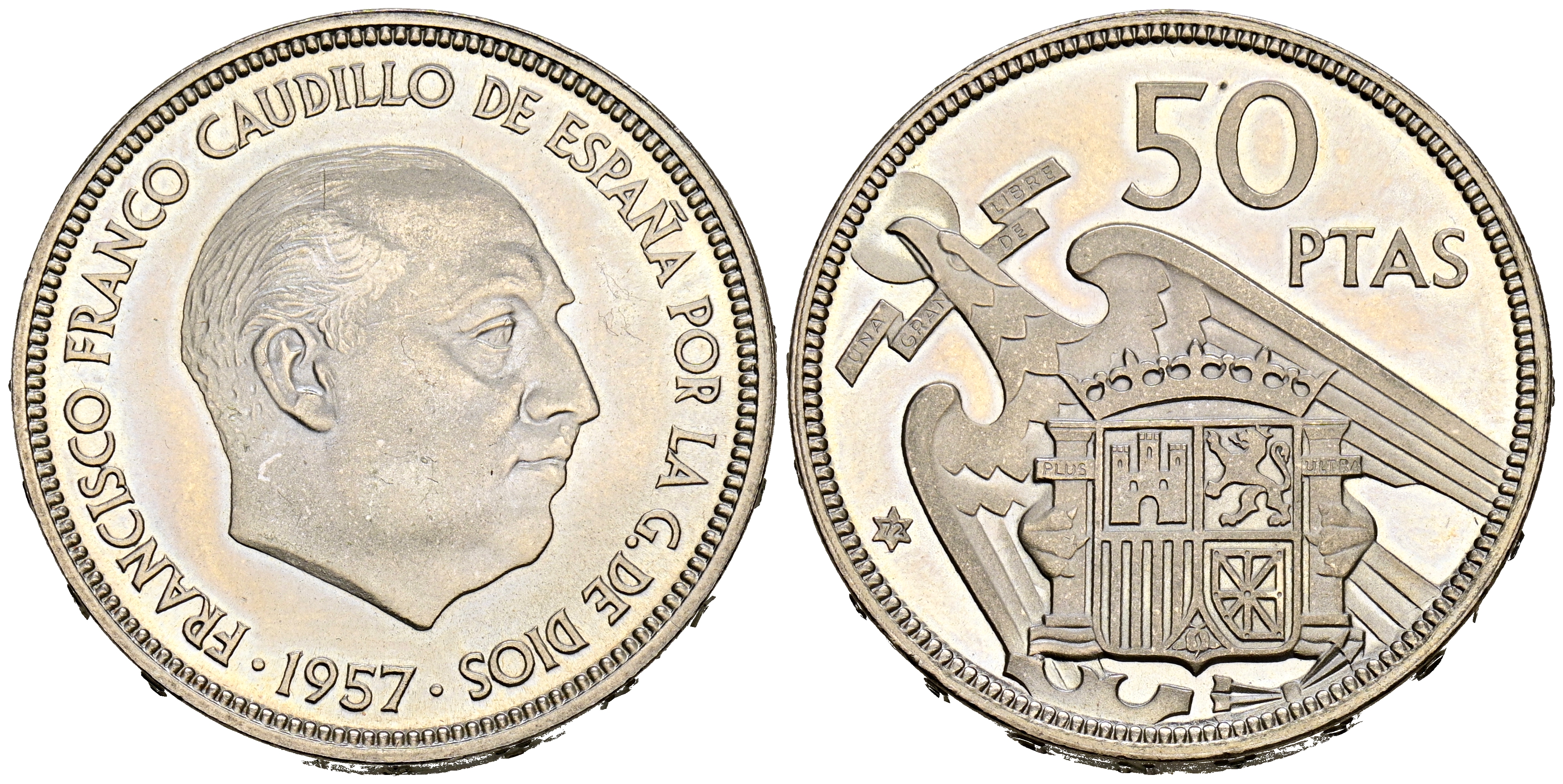 ESTADO ESPAÑOL (1936-1975). 50 Pesetas. (Ni. 12,49g/30mm). 1957 *72. Madrid. (Cal-2019-141). SC. Extraída de cartera.