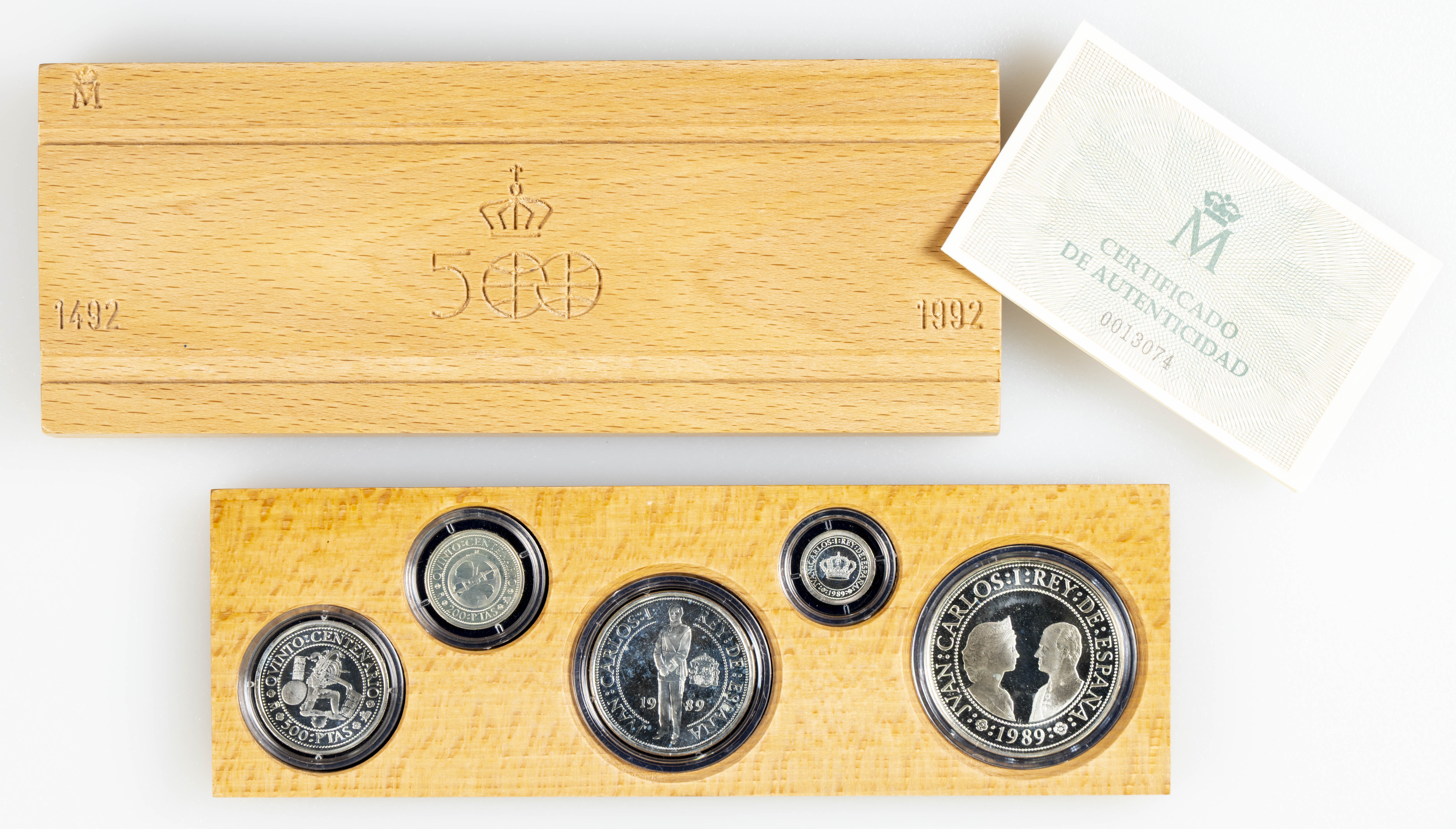 JUAN CARLOS I (1975-2014). Estuche completo compuesto por 5 monedas en plata de valores comprendidos entre 100 y 2000 Pesetas. Quinto Centenario. 1989. Serie I. FNMT. FDC Brillo. Incluye estuche original y certificado de autenticidad.