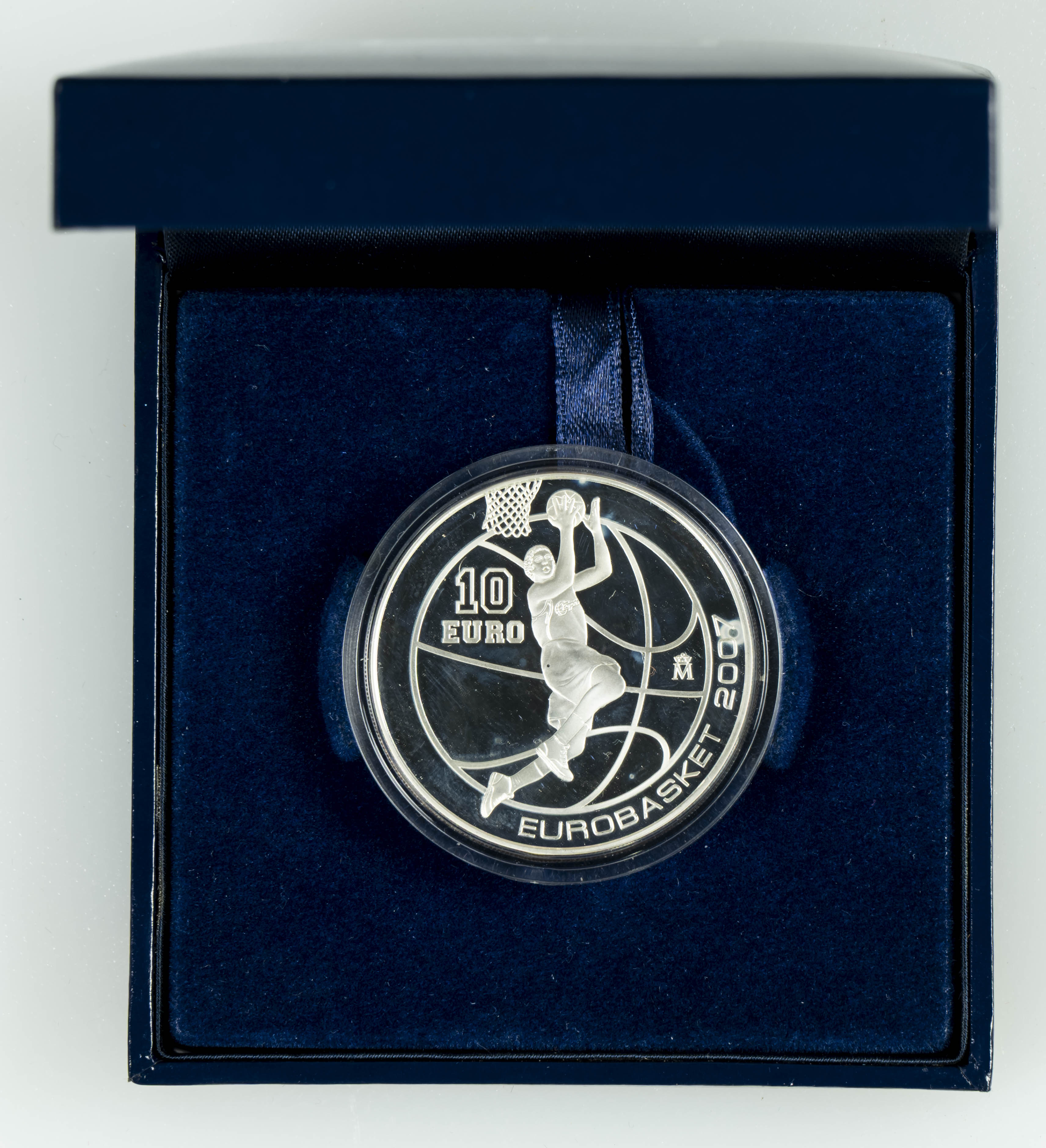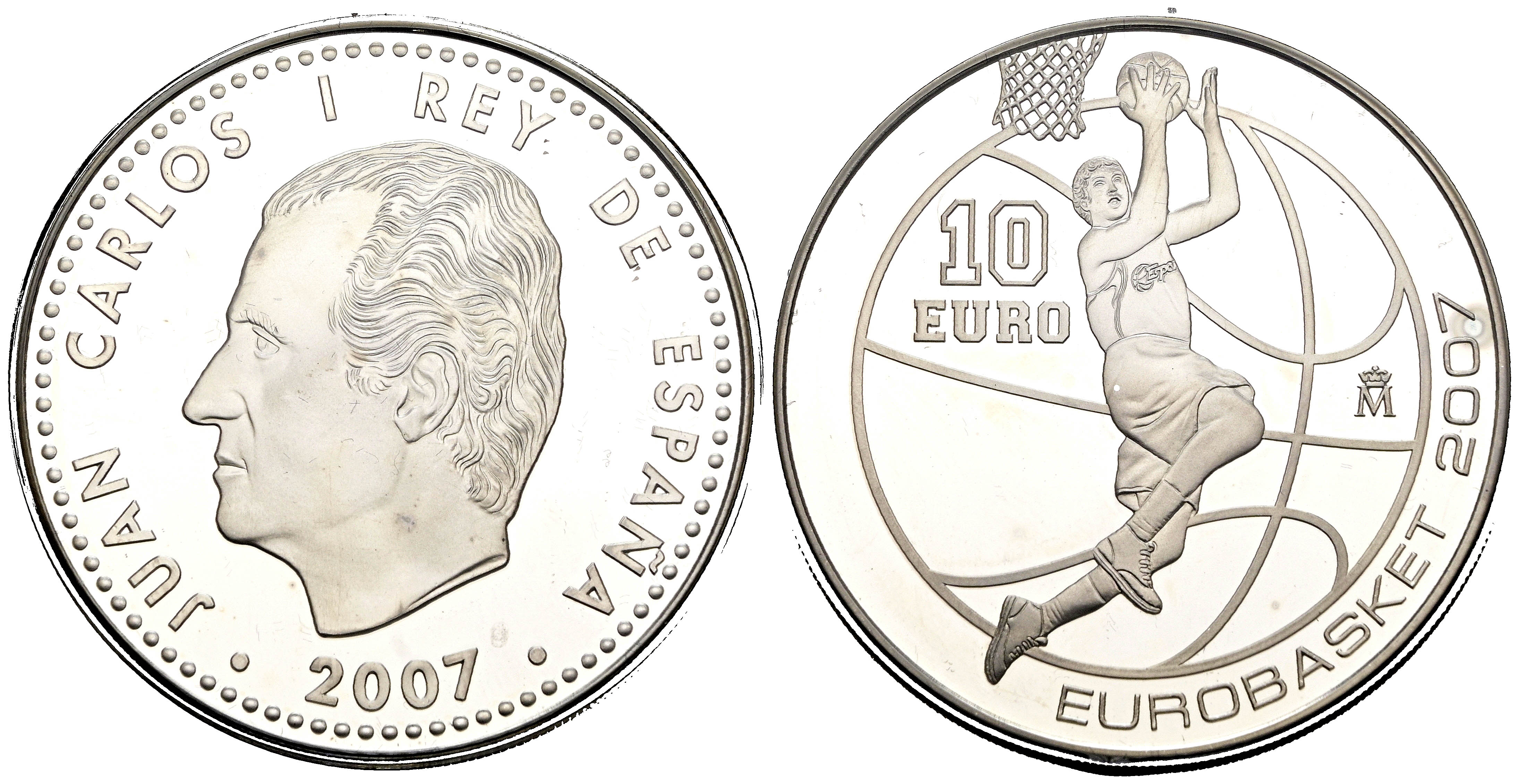 JUAN CARLOS I (1975-2014). 10 Euros. (Ar. 27,00g/40mm). 2007. FNMT. Eurobasket 2007. Salto a canasta. PROOF. Incluye cápsula, estuche original y certificado de autenticidad. Tirada de 12.000 ejemplares.