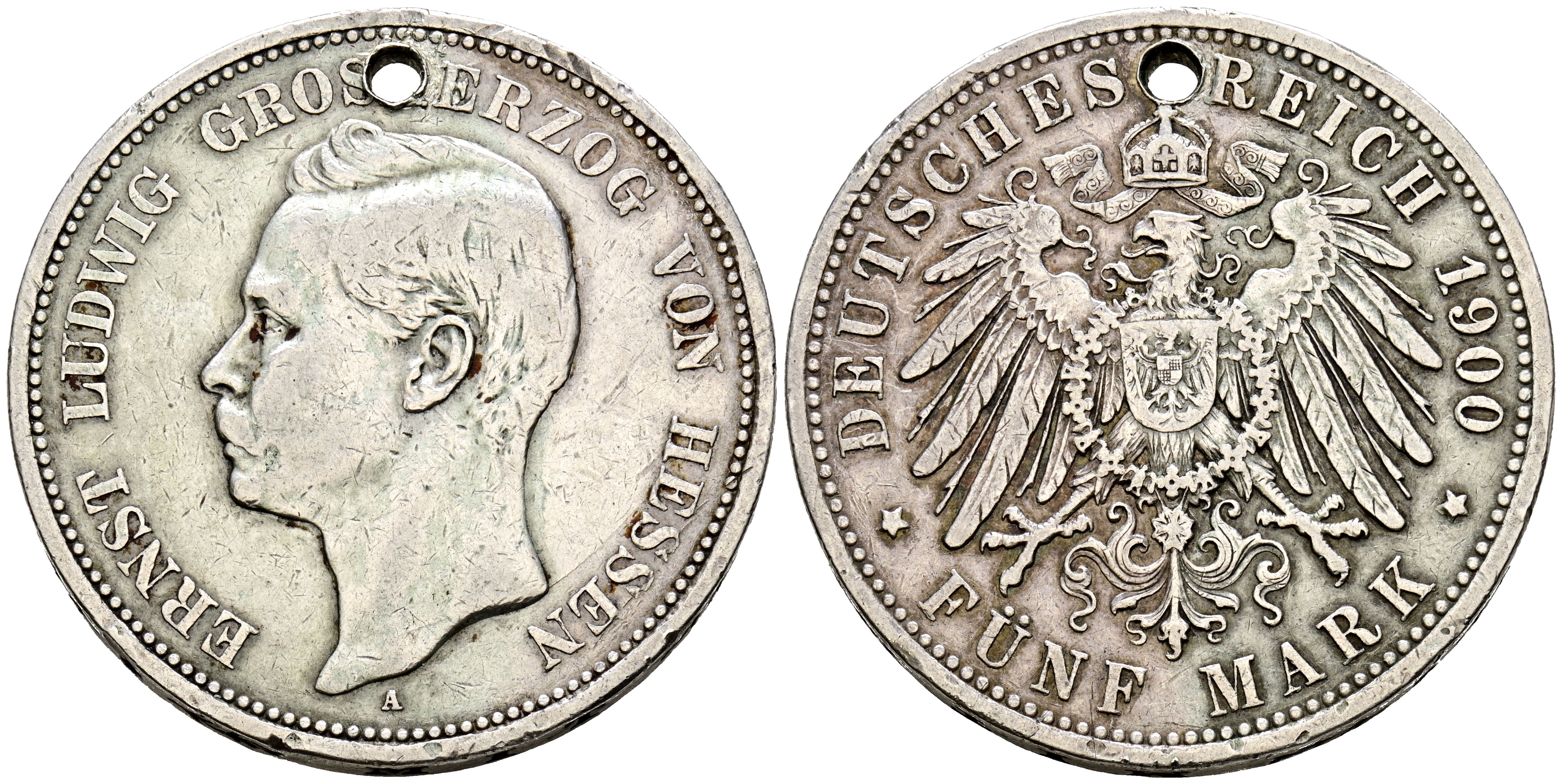 ALEMANIA. Ernesto Ludwig (1892-1918). 5 Marcos. (Ar. 27,53/38mm). 1900. Berlín A. (Km#369). MBC-. Perforación.