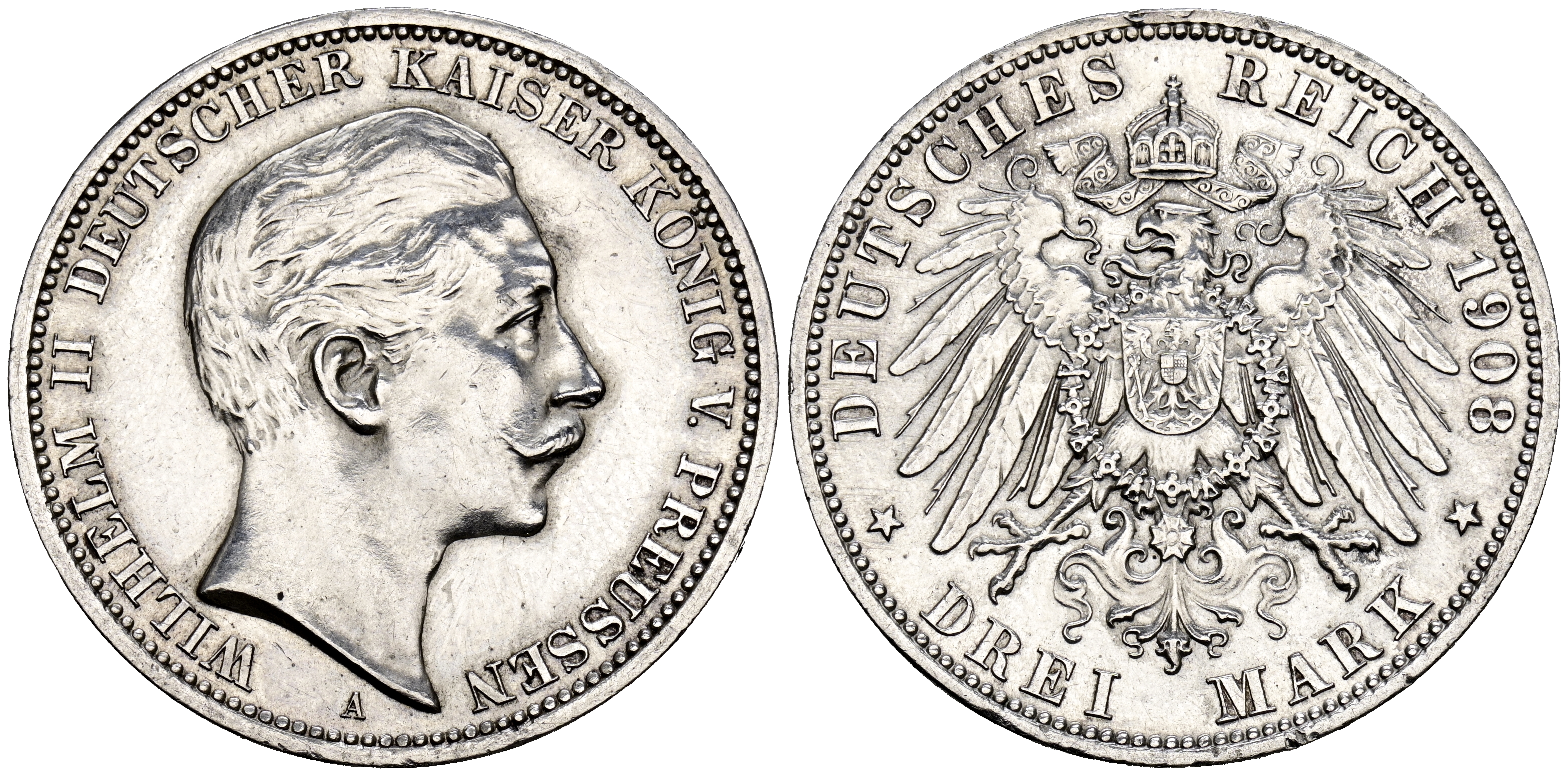 ALEMANIA, Wilhelm II. 3 Mark (Ar. 16,67g/33mm). 1908. Berlín A. (Km#527). MBC+. Limpiada.
