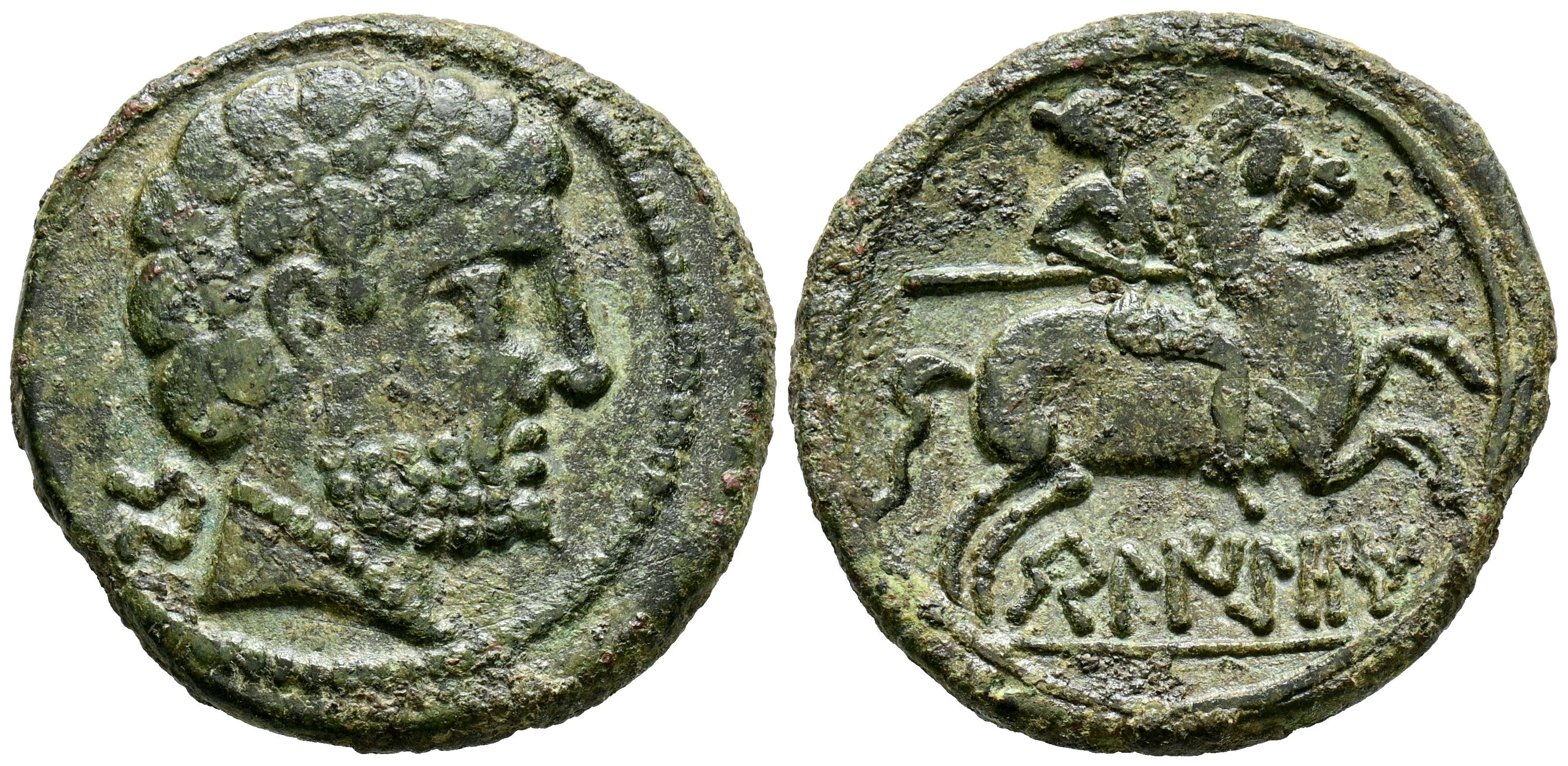 BELIGIOM (Belchite, Zaragoza). As. (Ae. 7,61g/25mm). 120-20 a.C. (FAB-243). Anv: Cabeza masculina barbada a derecha, detrás letra ibérica: Be. Rev: Jinete con lanza a derecha, debajo leyenda ibérica: BeLIGiOM. MBC+. Interesante ejemplar.
