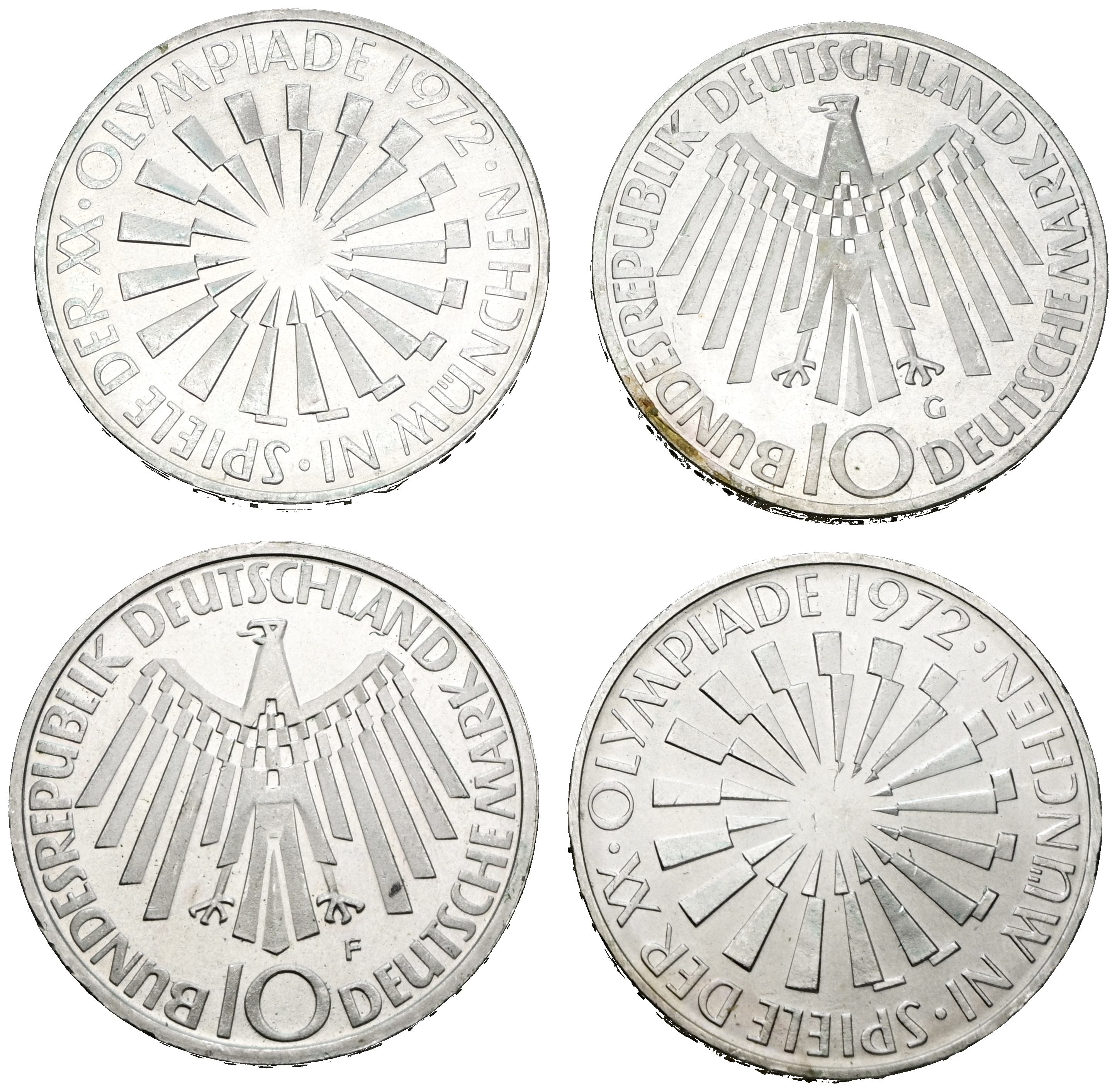 ALEMANIA. Conjunto de 10 Mark con las 4 cecas diferentes (D, F, G y J). 1972. Juegos Olímpicos de Munich. (Km#134.1). SC.