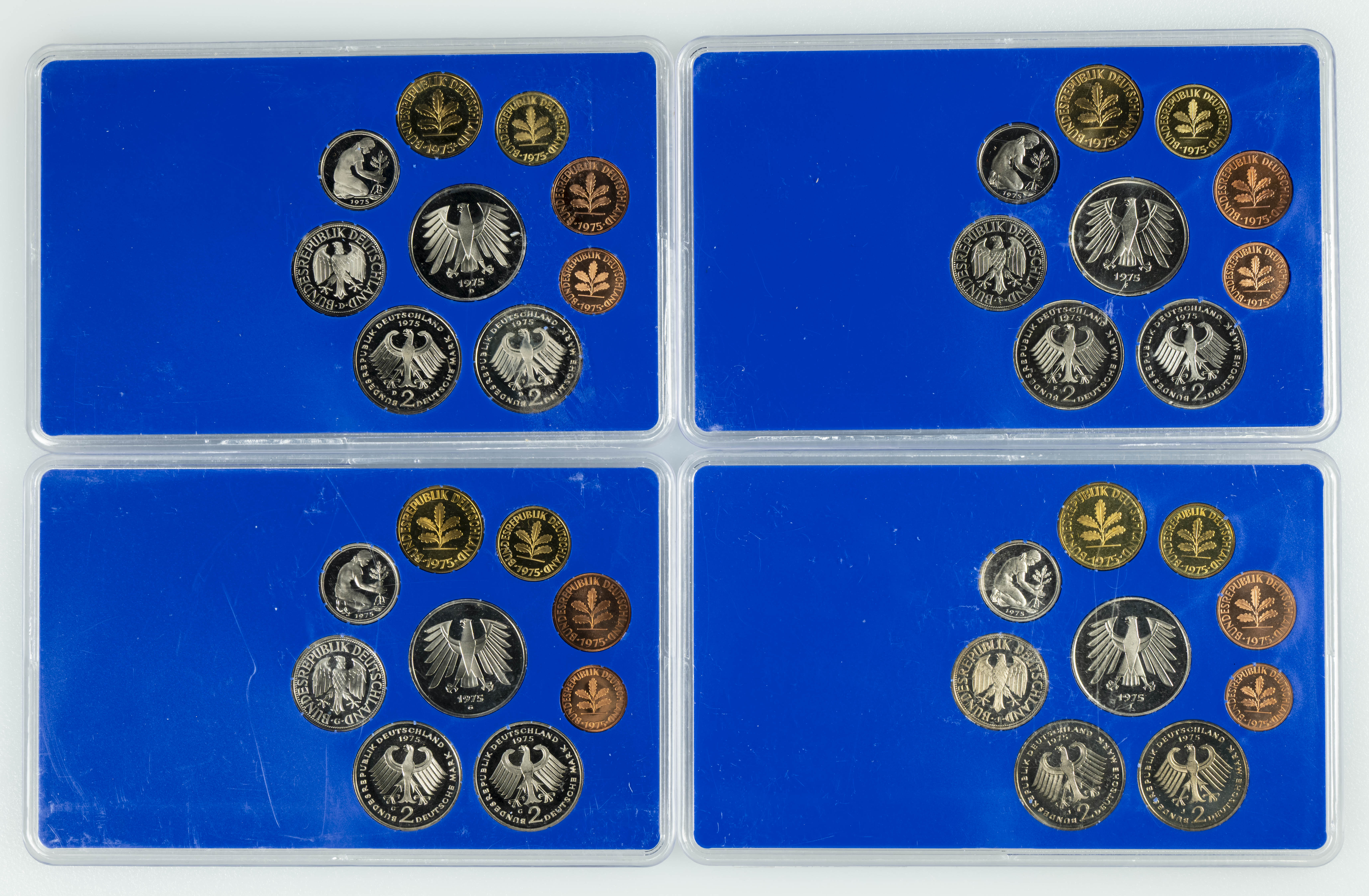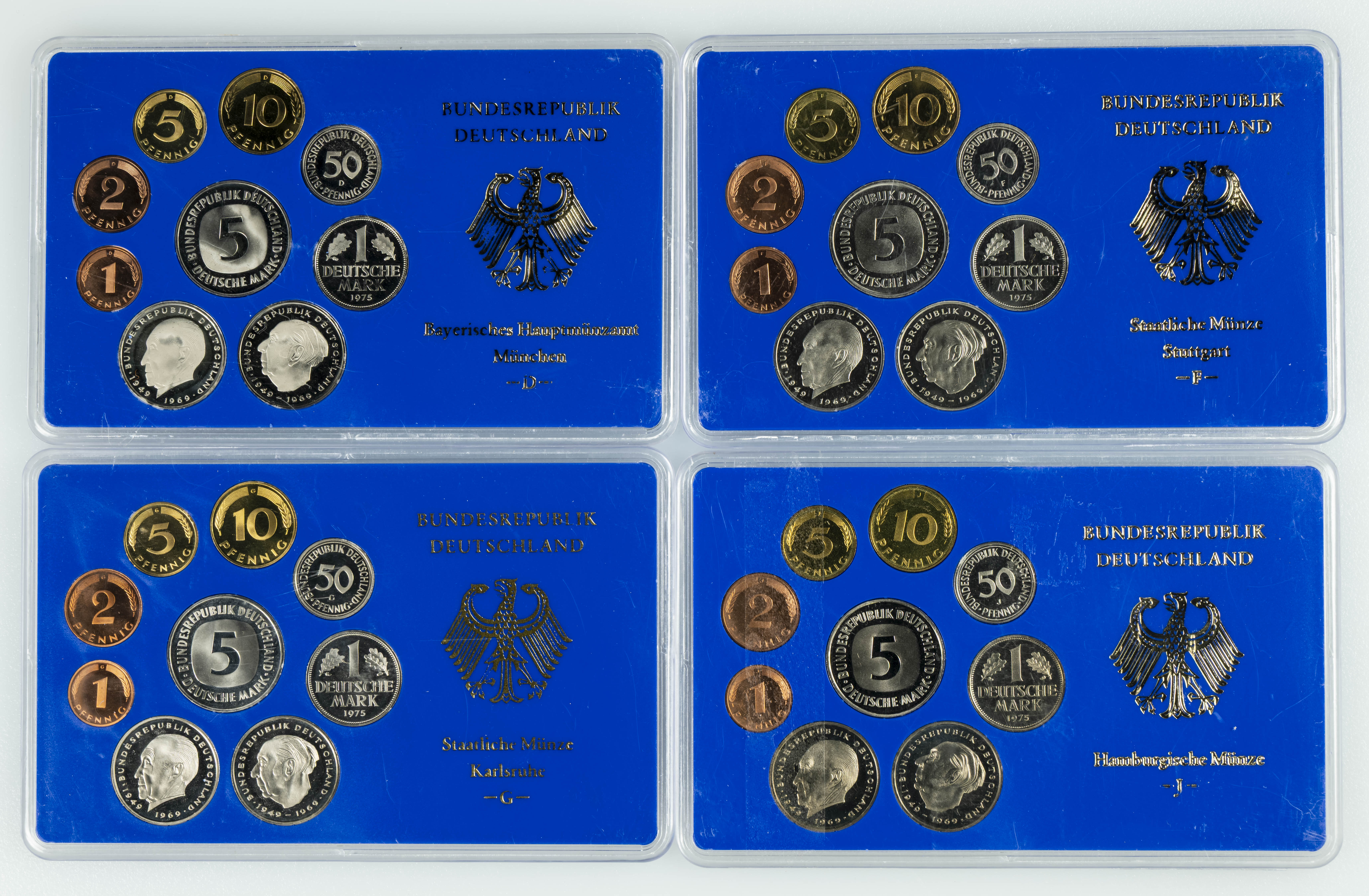 ALEMANIA. Conjunto de 4 sets de 1975 con cecas diferentes: Munich (D), Stuttgart (F), Karlsruhe (G) y Hamburgo (J). PROOF.