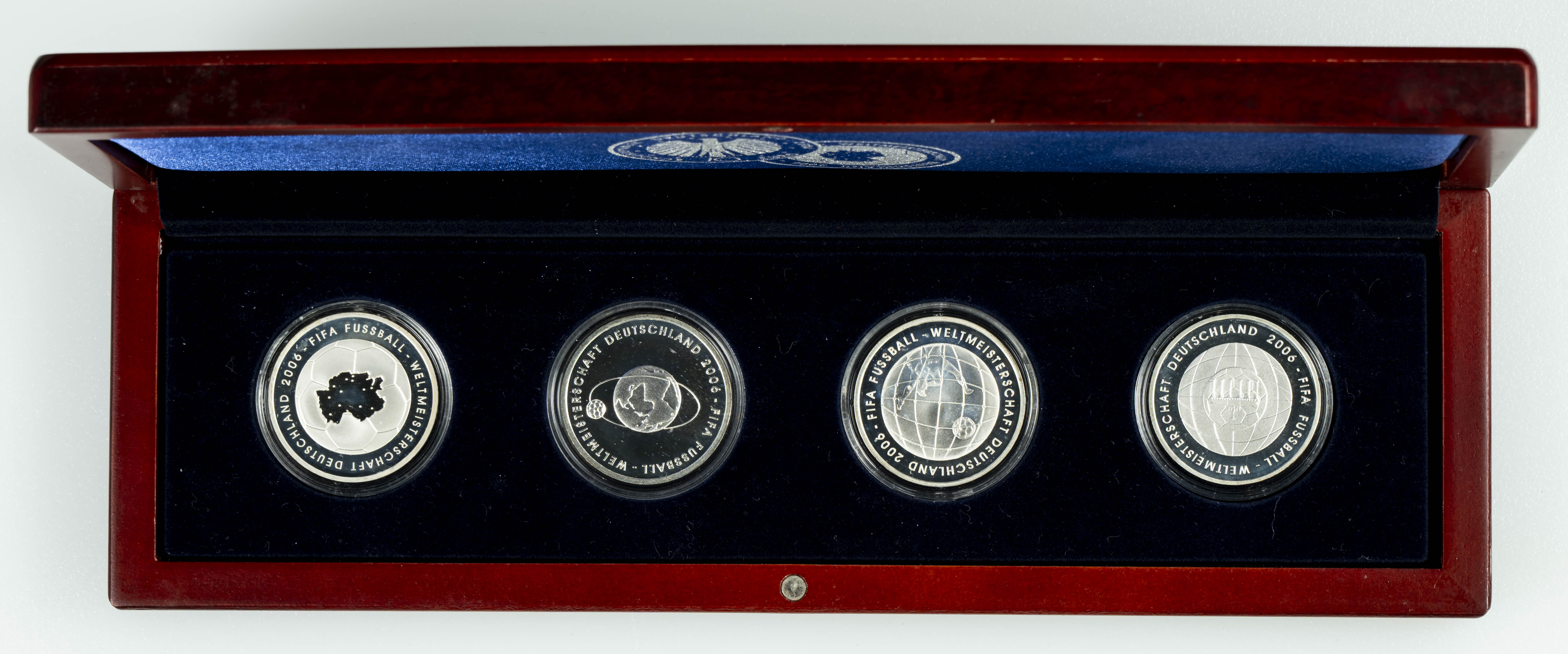 ALEMANIA. Estuche compuesto por 4 monedas de 10 Euros conmemorativas de la Copa del Mundo de la FIFA de 2006. PROOF. Estuche de madera.