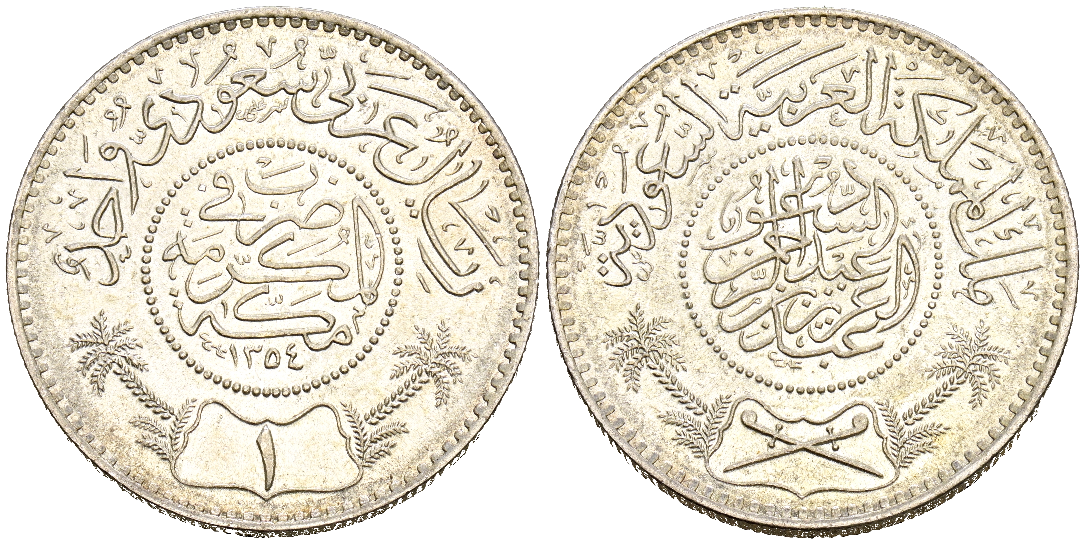 ARABIA SAUDÍ, Saud bin Abdulaziz (1953-1964). 1 Riyal. (Ar. 11,62g/30mm). 1955. (1374H). (Km#39). SC. Brillo original.