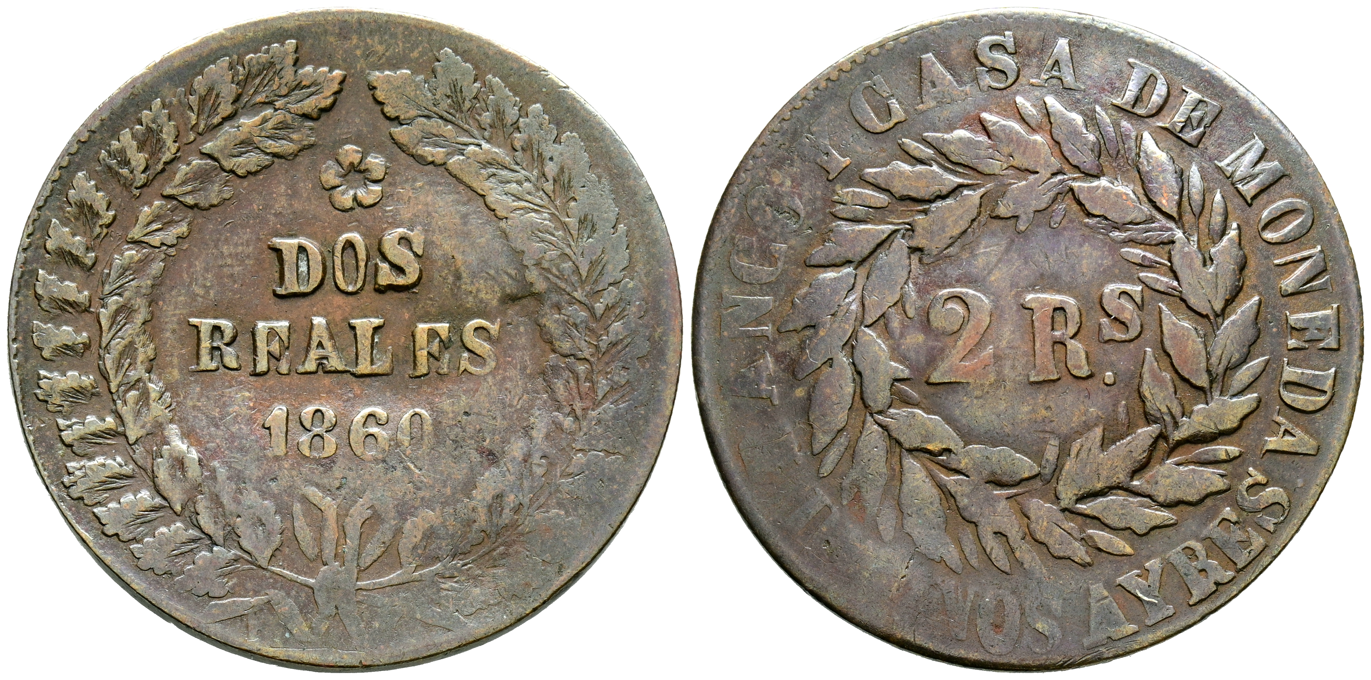 ARGENTINA. 2 Reales. (Ae. 7,24g/32mm). 1860. Buenos Aires. (Km#11). MBC-. Alabeada.