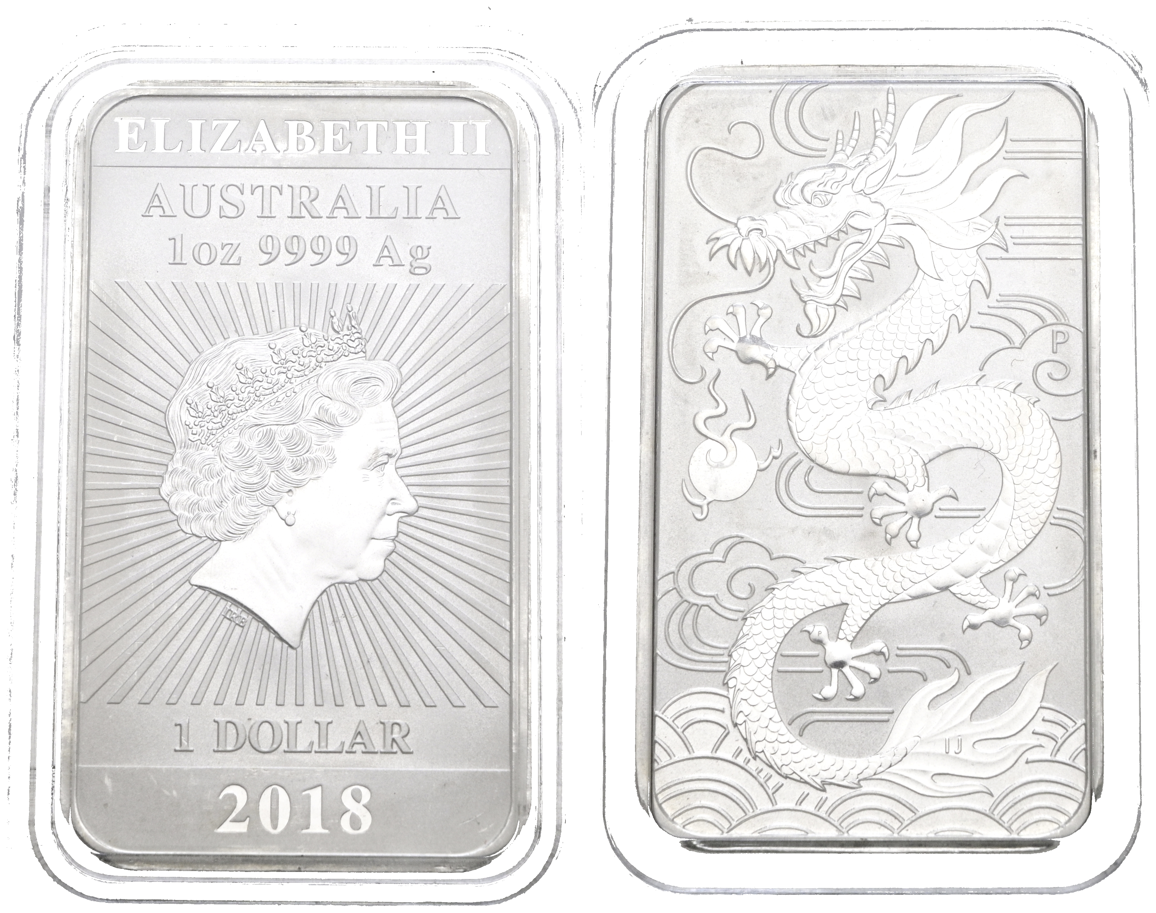 AUSTRALIA. 1 Dollar. (Ar. 31,33g/27mm). 2018. Dragón. Pieza tipo lingote. Plata de 0,999 milésimas. SC. Incluye cápusla.