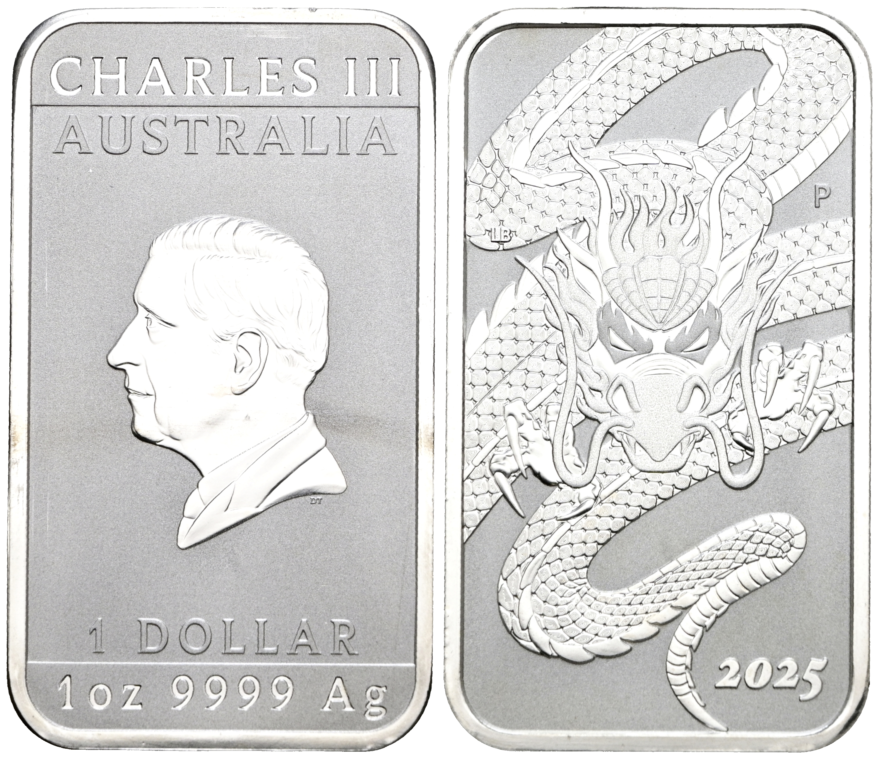 AUSTRALIA. 1 Dollar. (Ar. 31,35g/27mm). 2025. Perth. Dragón. Moneda rectangular. Plata de 0,999 milésimas. SC.