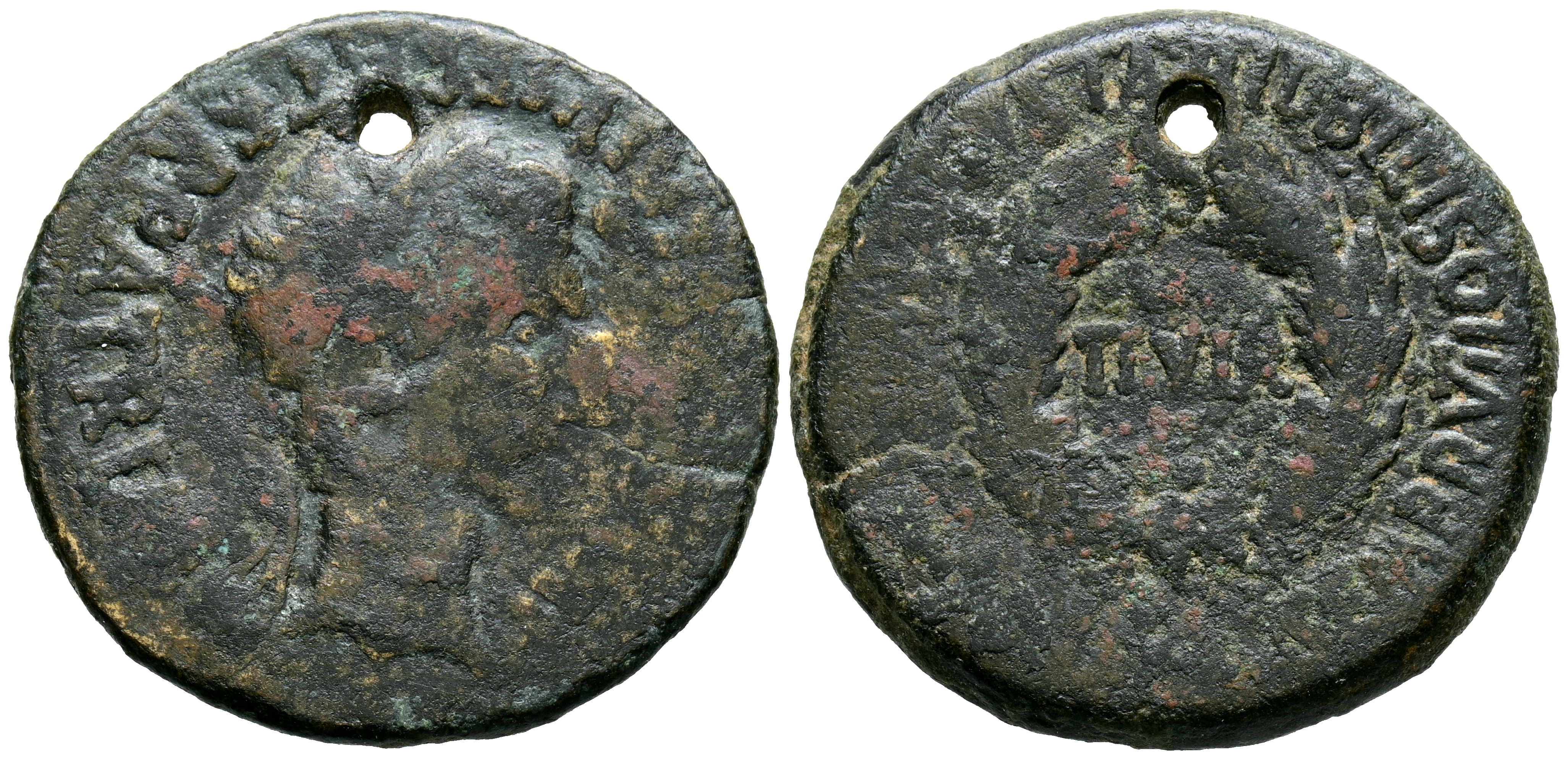 BILBILIS (Calatayud, Zaragoza). As. (Ae. 11,68g/28mm). 27 a.C.-14 d.C. (FAB-278). Anv: Cabeza laureada de Augusto a derecha, alrededor leyenda: AVGVSTVS DIVI F PATER PATRIAE. Rev: Corona de laurel, dentro: II VIR, alrededor leyenda: MVN AVGVSTA BILBILIS M SEMP TIBERI L LICI VARO. BC+. Perforación.