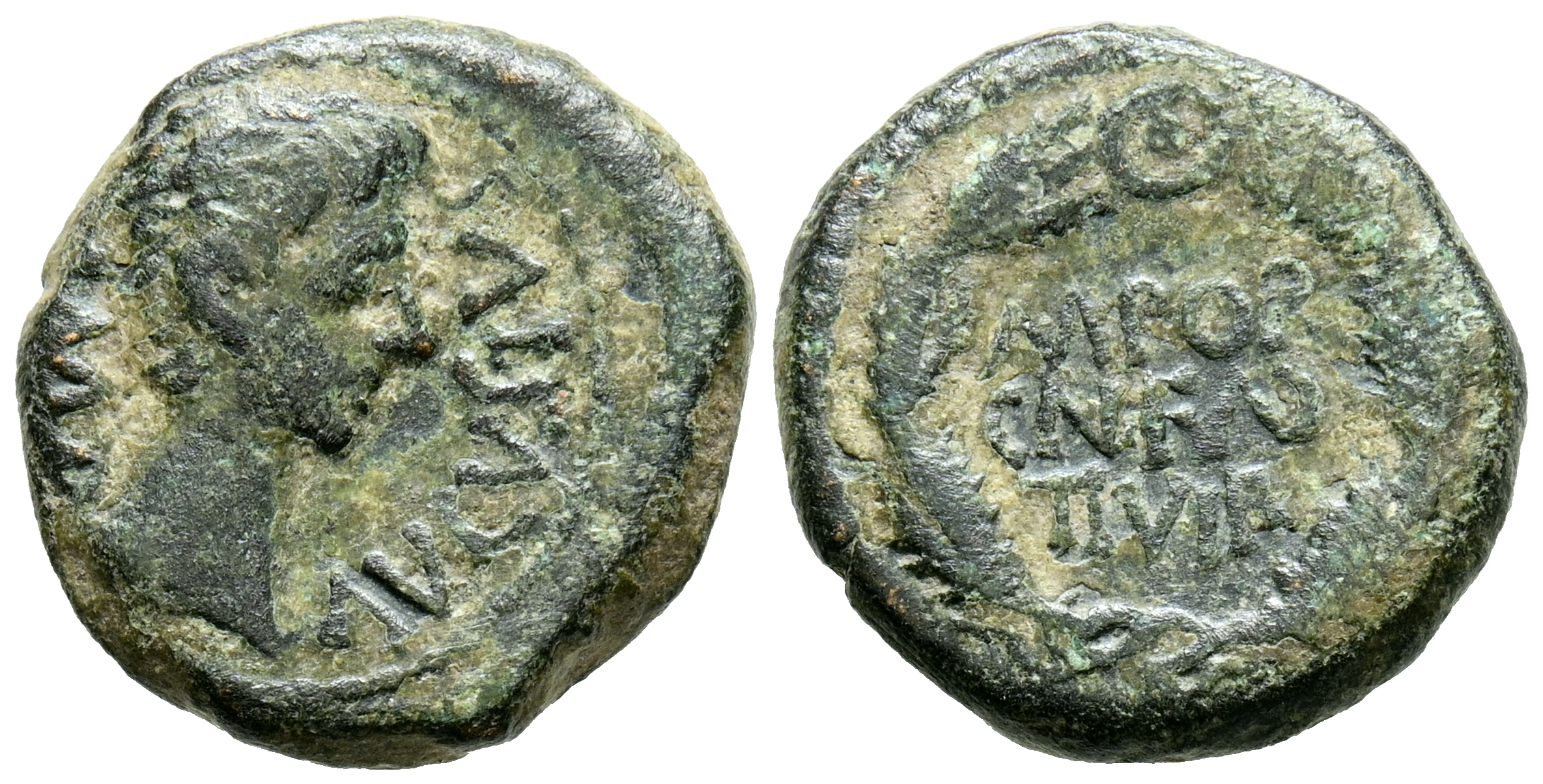 CAESARAUGUSTA (Zaragoza). Cuadrante. (Ae. 3,56g/16mm). 27 a.C.-14 d.C. (FAB-341). Anv: Cabeza desnuda de Augusto a derecha, alrededor leyenda: AVGVSTVS IMP. Rev: Leyenda: M POR CN FAD II VIR, dentro de corona de laurel. MBC.
