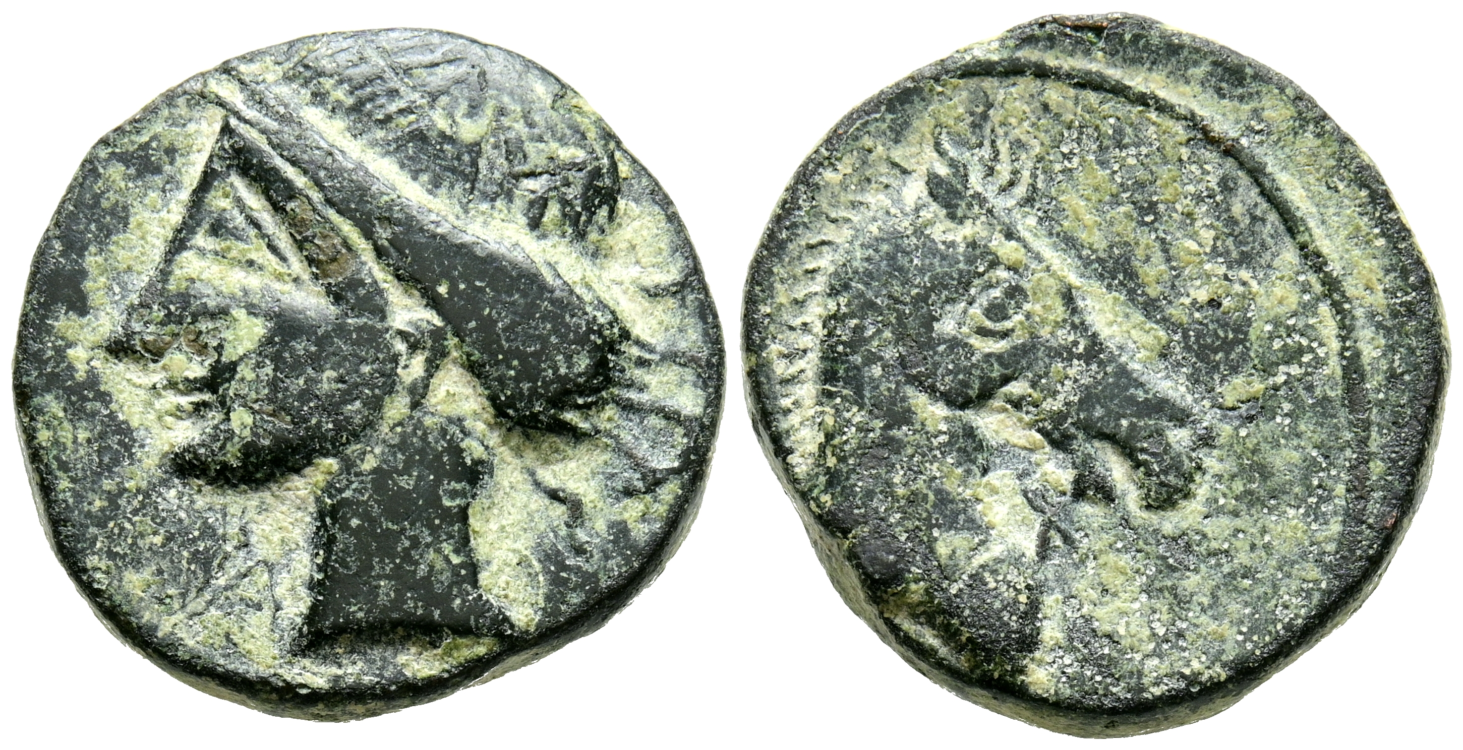 CARTAGONOVA (Cartagena, Murcia). Calco. (Ae. 7,90g/20mm). 220-215 a.C. (FAB-510). Anv: Cabeza de Tanit a izquierda. Rev: Cabeza de caballo a derecha. MBC.