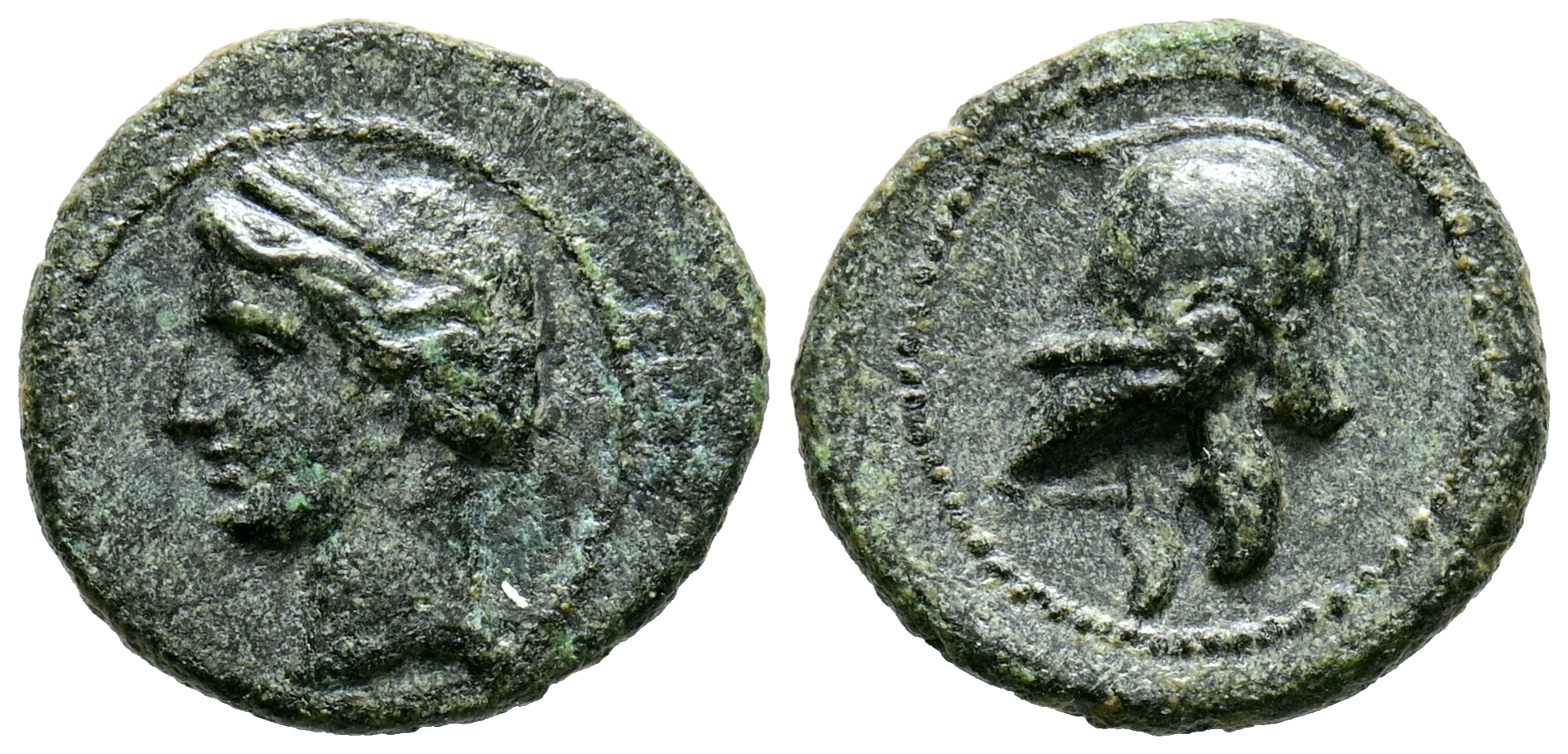 CARTAGONOVA (Cartagena, Murcia). 1/4 de Calco. (Ae. 1,65g/13mm). 220-215 d.C. (FAB-523). Anv: Cabeza de Atenea a izquierda. Rev: Casco a izquierda. EBC.