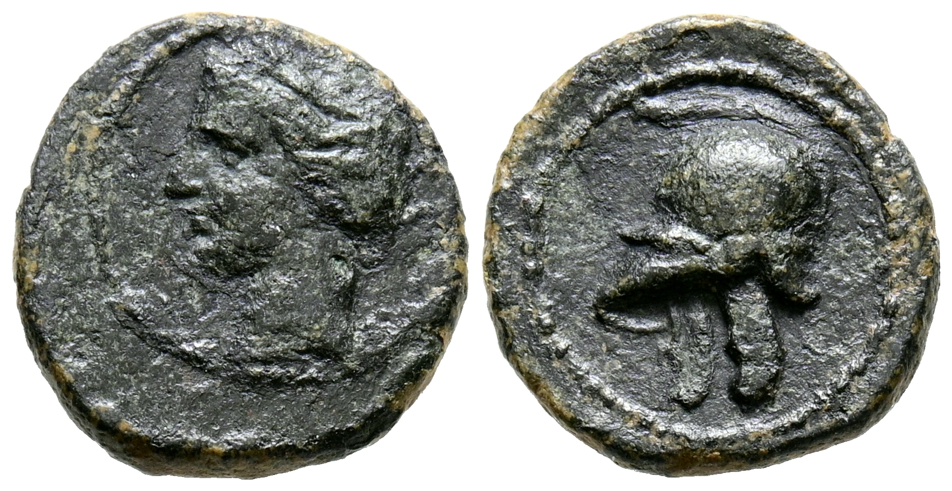 CARTAGONOVA (Cartagena, Murcia). 1/4 de Calco. (Ae. 1,41g/13mm). 220-215 d.C. (FAB-523). Anv: Cabeza de Atenea a izquierda. Rev: Casco a izquierda. MBC/MBC+.