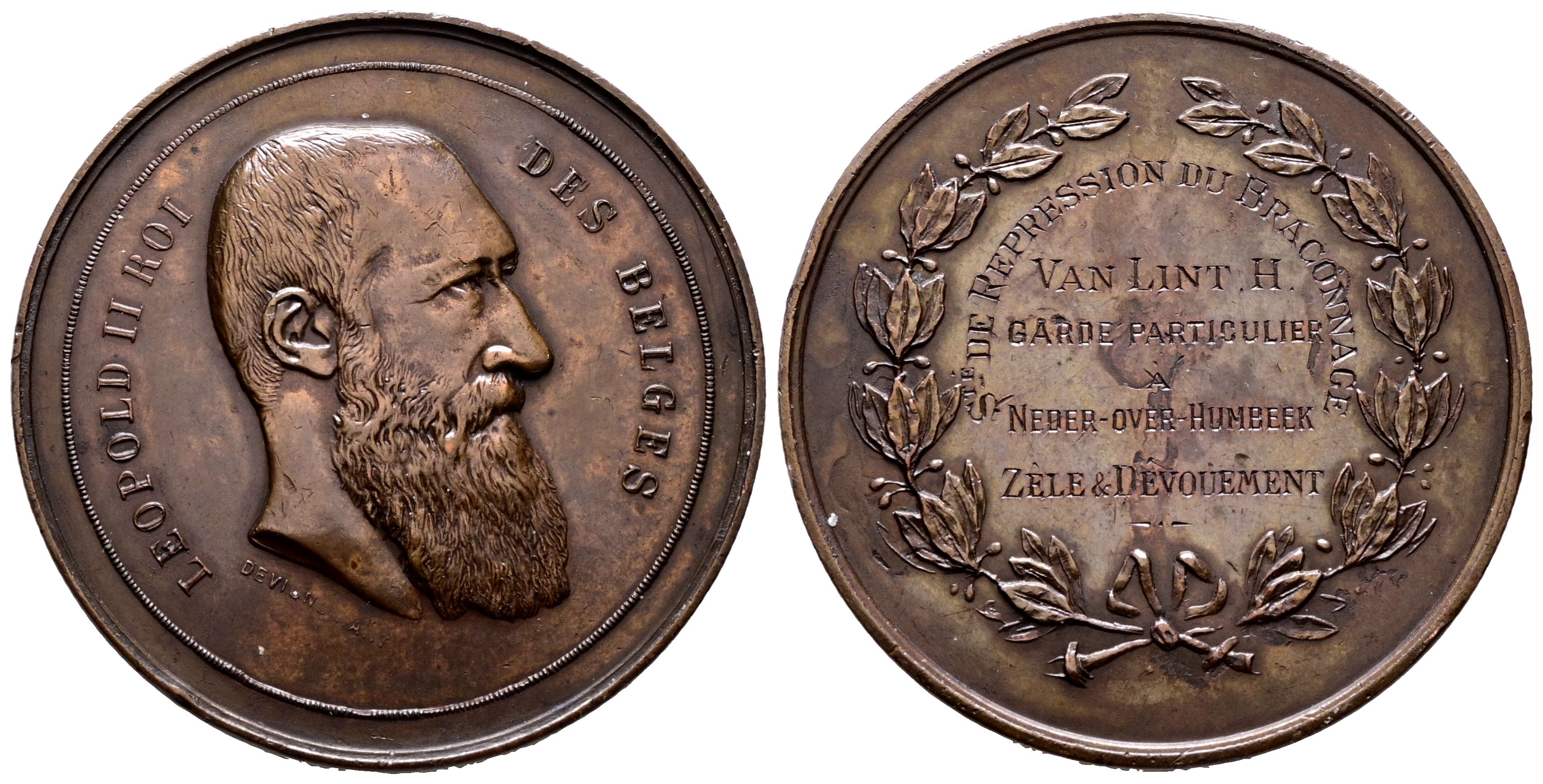 BÉLGICA, Leopoldo II (1865-1909). Medalla. (Ae. 41,33g/51mm). S/D. Grabador: Devigne Hant. Inscripción al reconocimiento personal y profesional en reverso. MBC+.