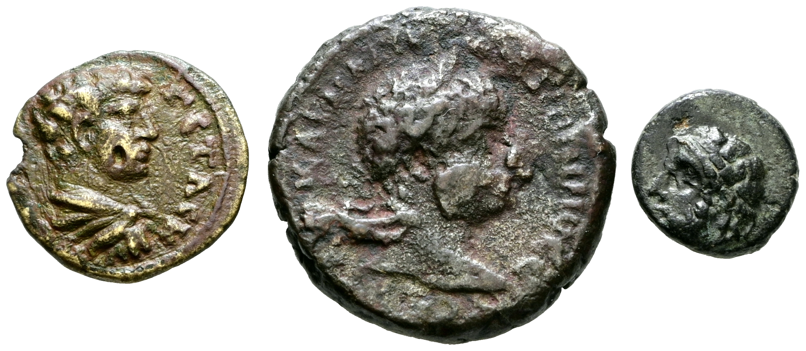 MONEDAS GRIEGAS e IMPERIO ROMANO. Interesante trío de acuñaciones greco-romanas. Diferentes módulos, medidas y estados de conservación. A EXAMINAR.
