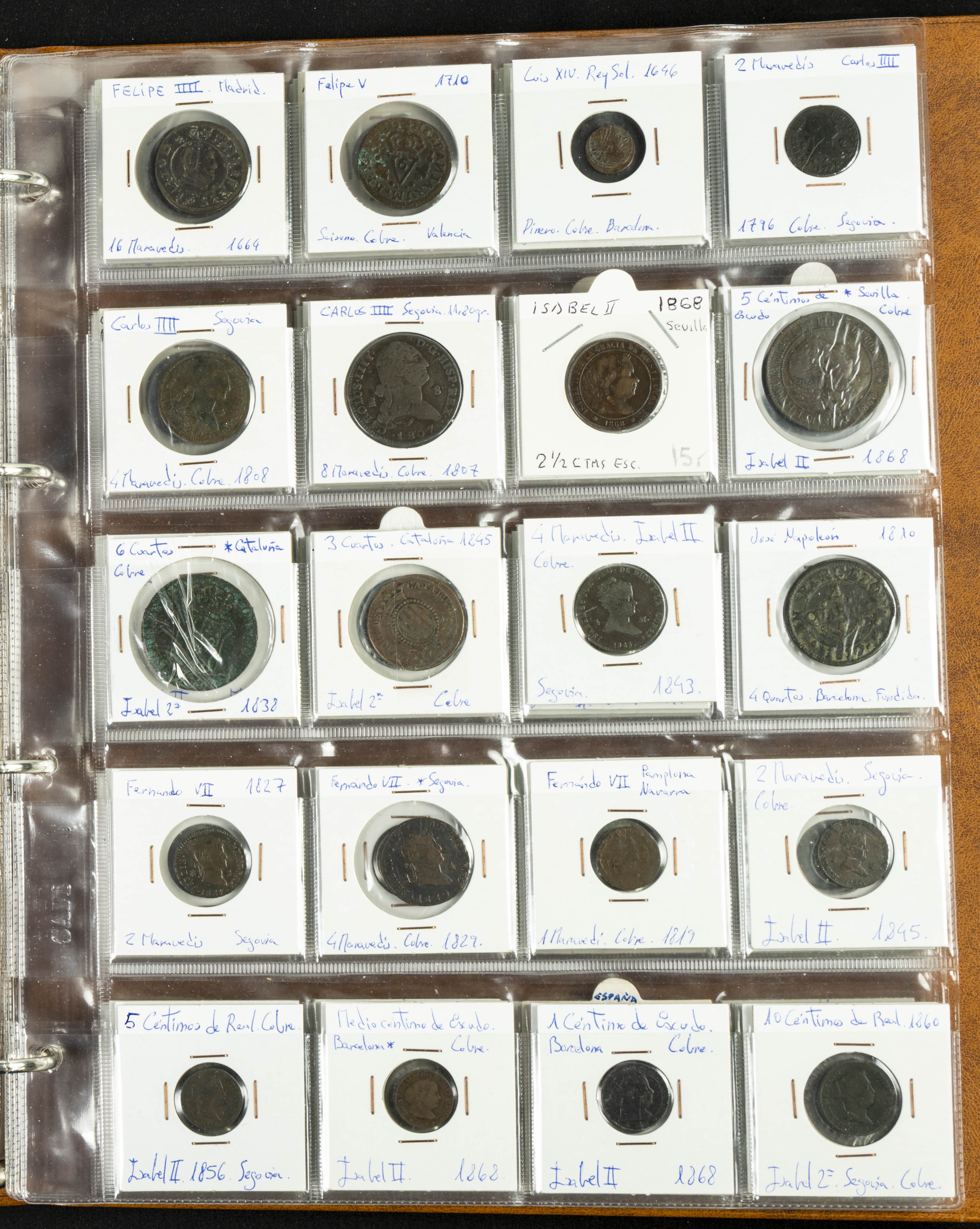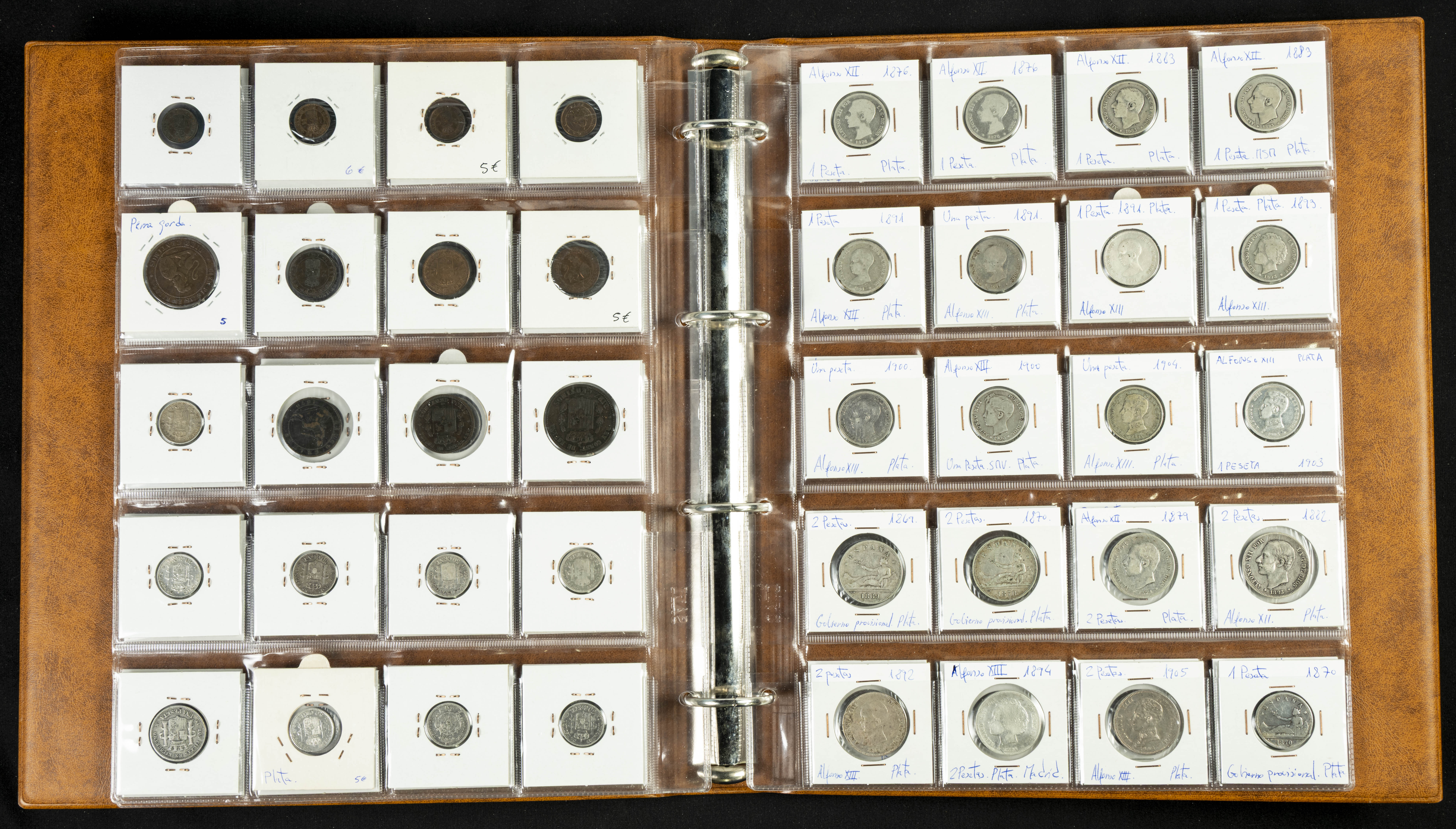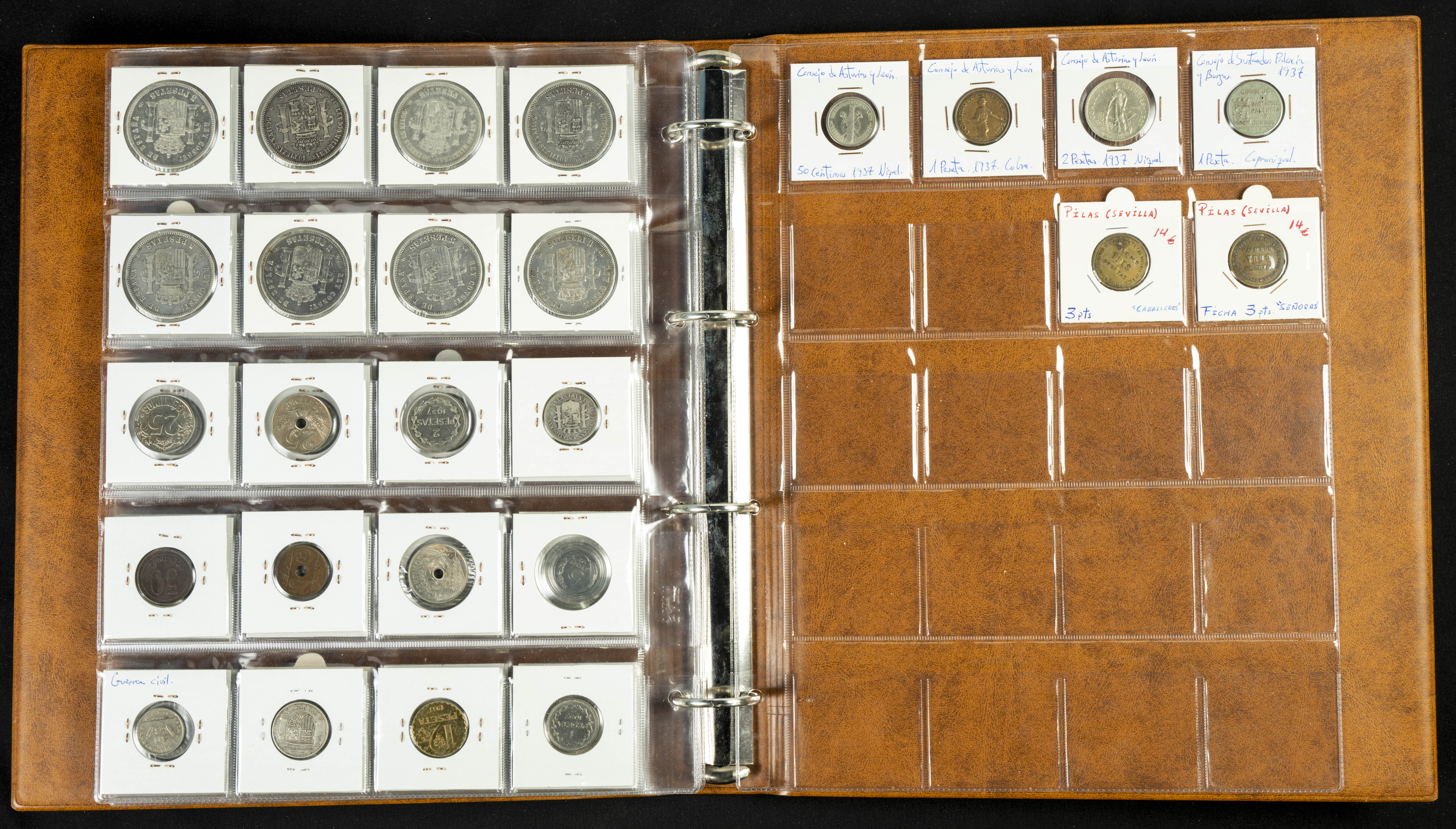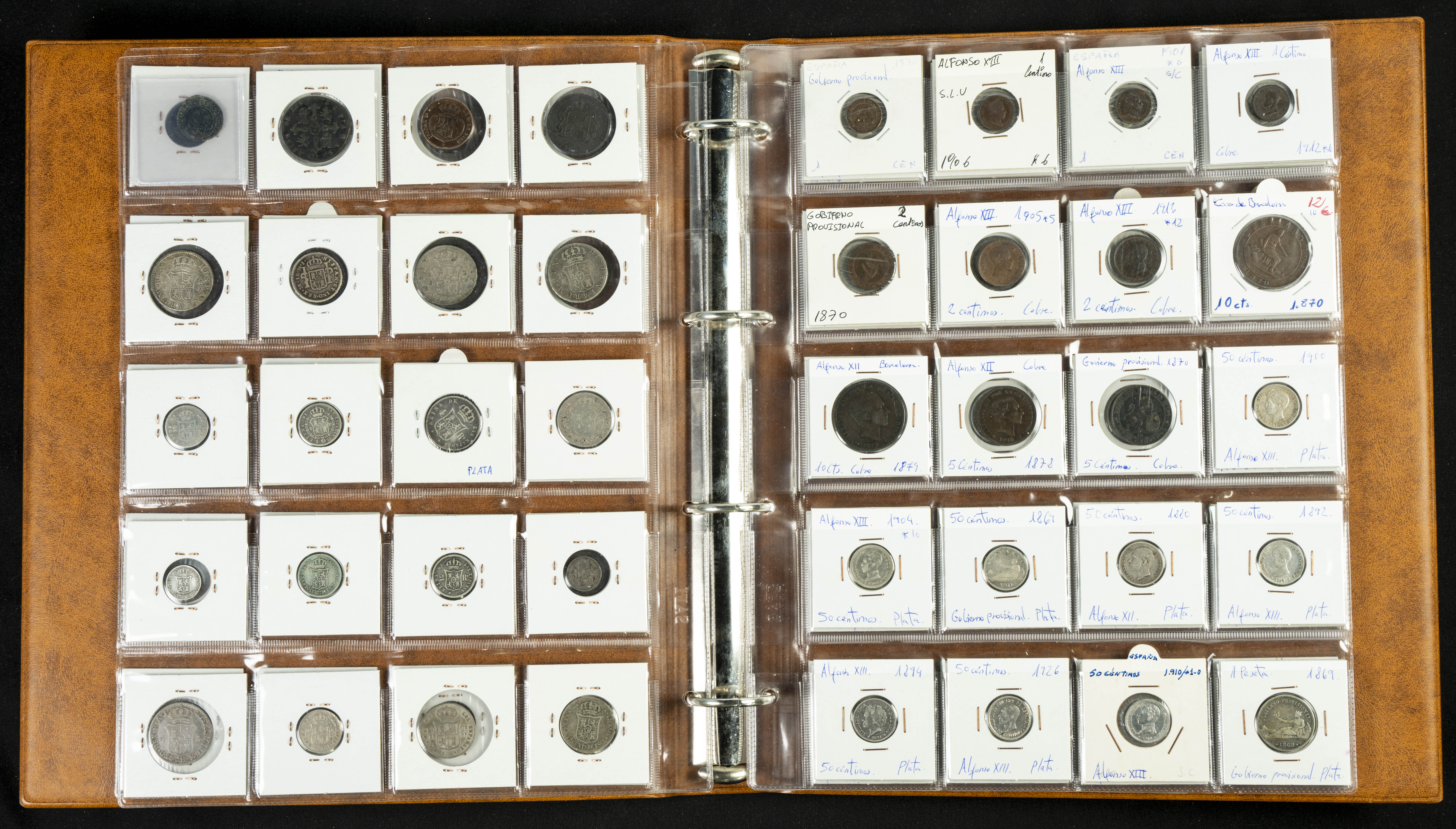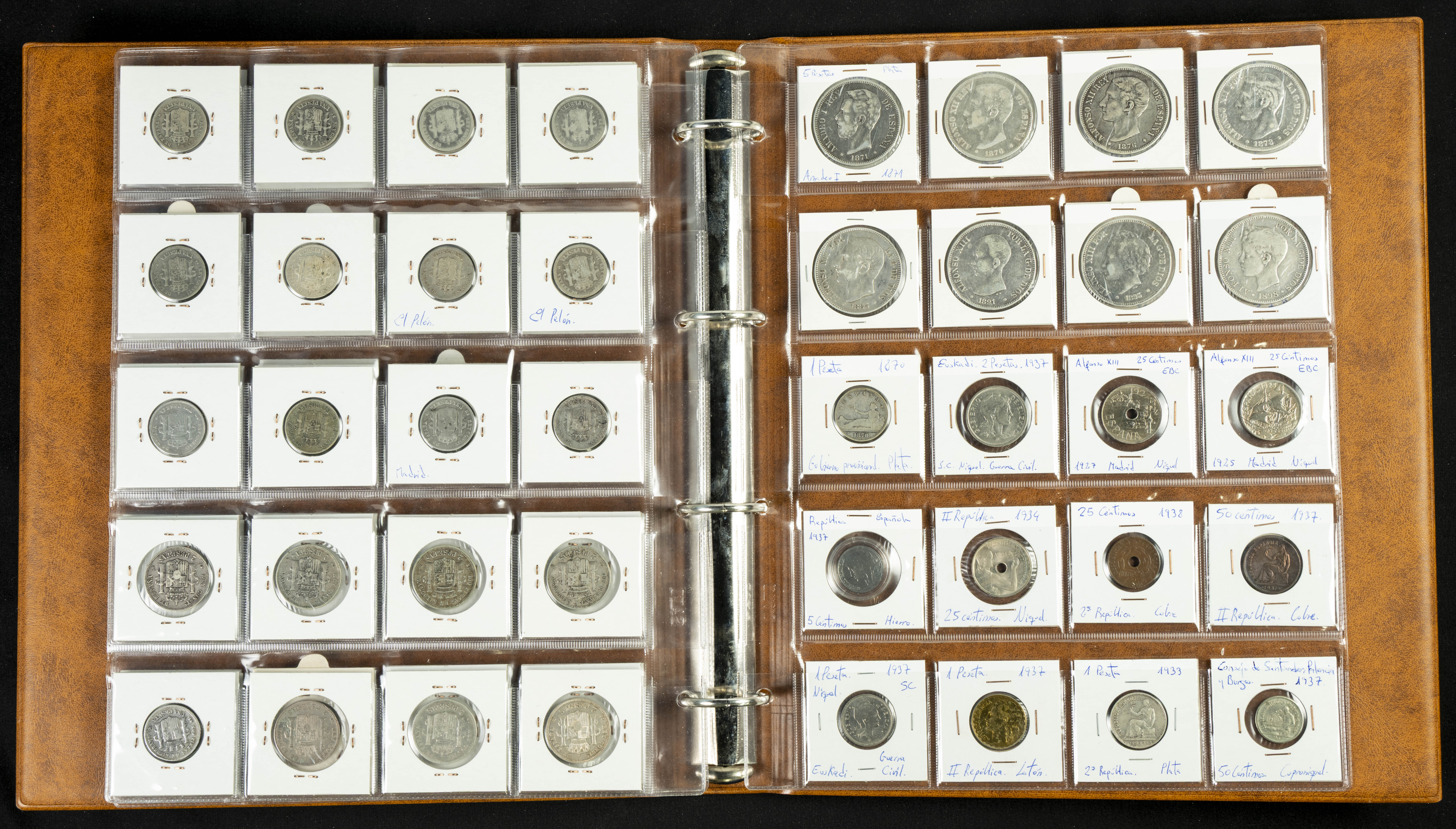 MONARQUÍA ESPAÑOLA Y CENTENARIO DE LA PESETA. Interesante y muy variado conjunto expuesto en album de más de 100 piezas, con un gran número de ellas en plata, de ambos periodos y que se remata con un pequeño resto de ejemplares de la II Républica y Guerra Civil. Diferentes estados de conservación. A EXAMINAR.