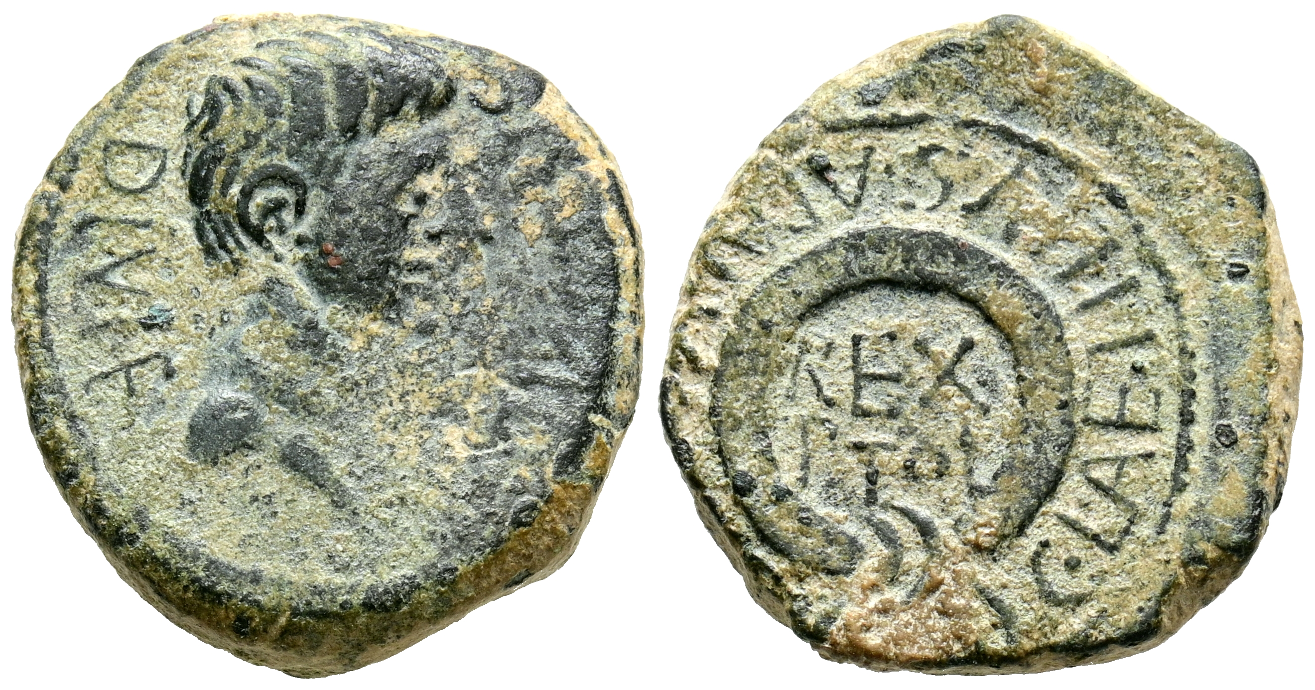 CARTAGONOVA (Cartagena, Murcia). Semis. (Ae. 5,33g/19mm). 27 a.C.-14 d.C. (FAB-590). Anv: Cabeza de Augusto a derecha, alrededor leyenda: AVGVSTVS DIVI F. Rev: Leyenda: REX/PTOL, dentro de láurea, alrededor leyenda: C LAETILIVS APALVS II V Q. MBC+.