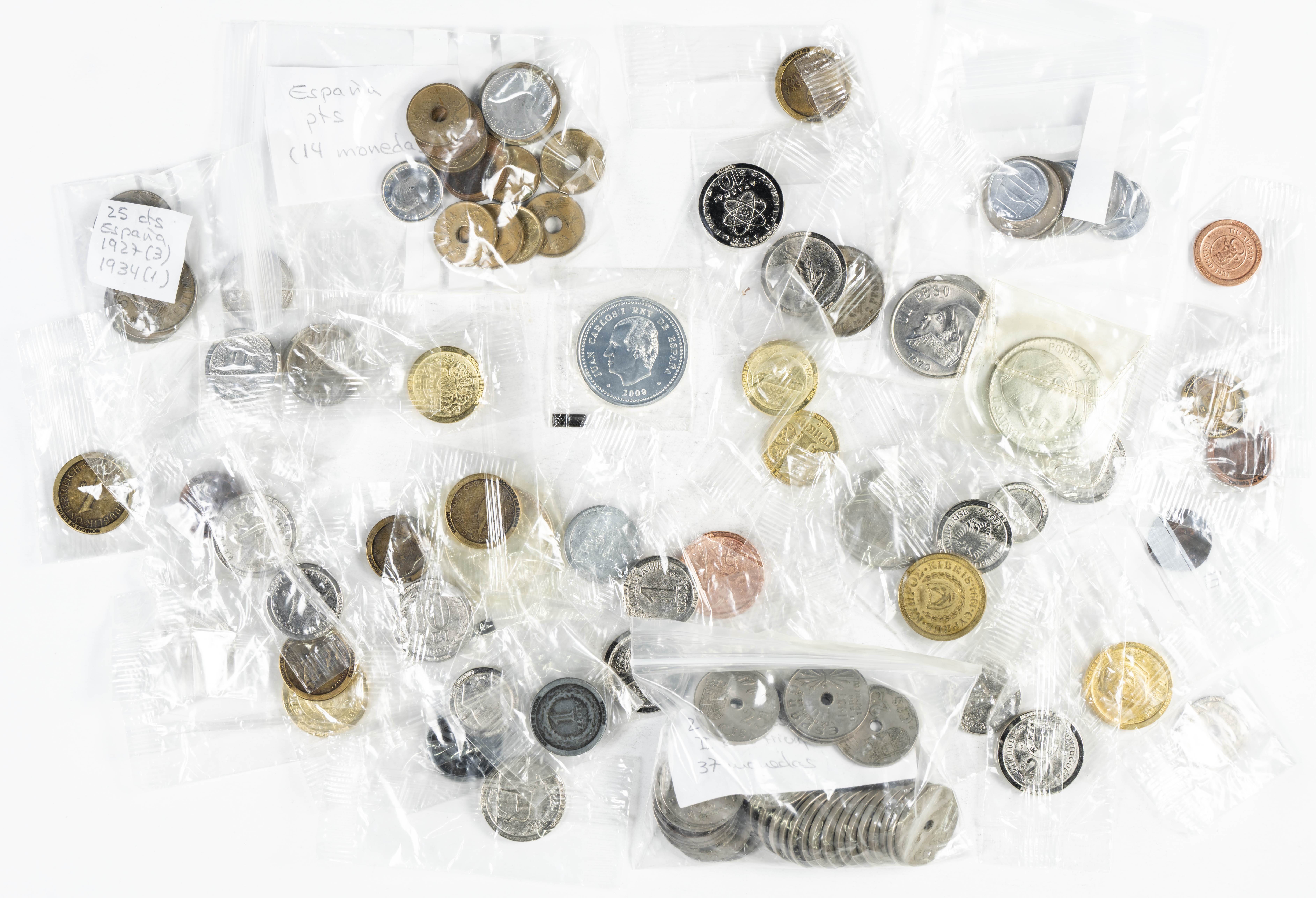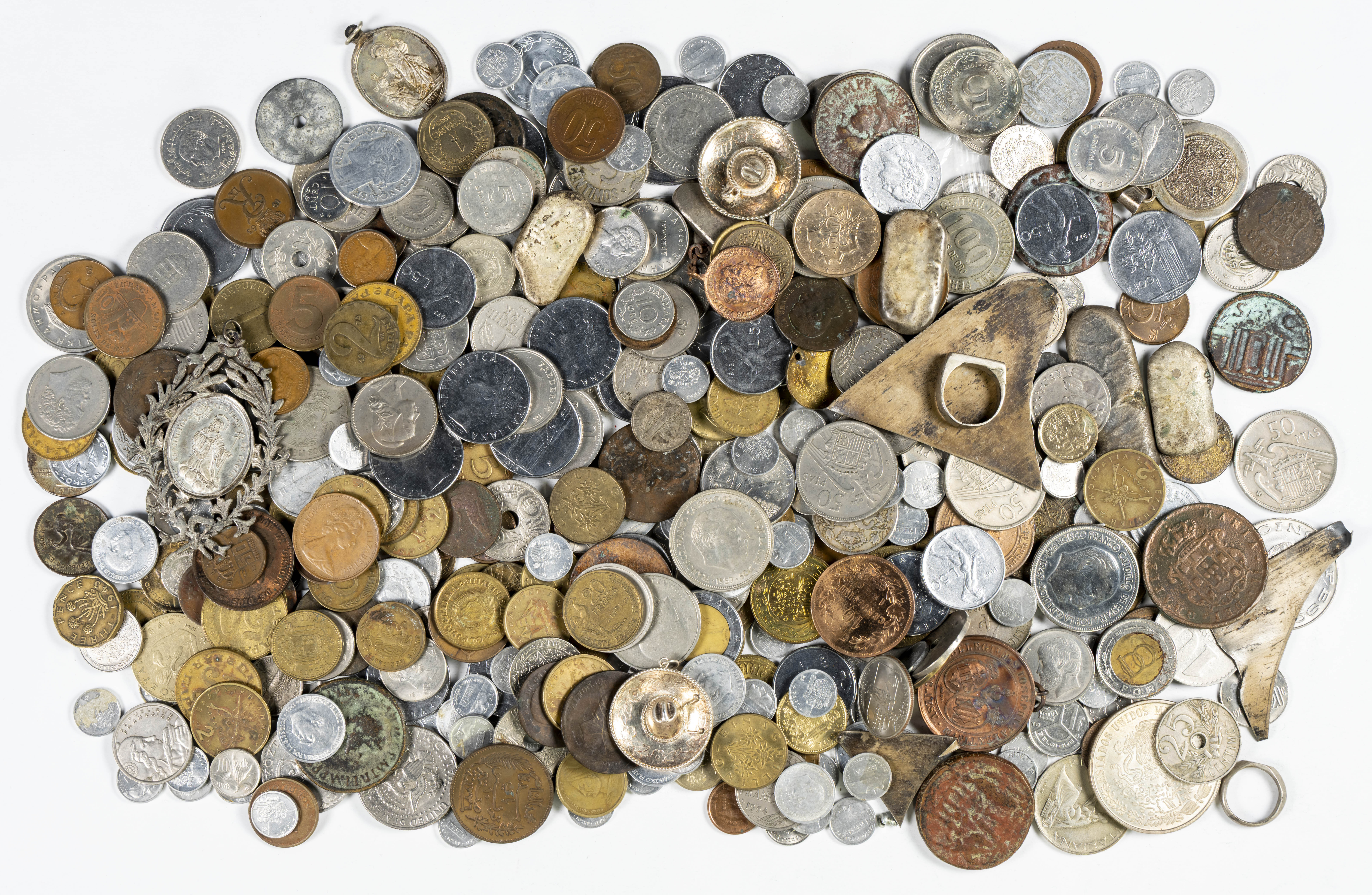 Interesante conjunto formado por cientos de piezas tanto españolas como extranjeras donde destacan algunos ejemplares en plata, incluyendo algunos pequeños lingotes y adornos. El conjunto incluye una pequeña parte de piezas de réplicas de colección. Diferentes estados de conservación. A EXAMINAR.