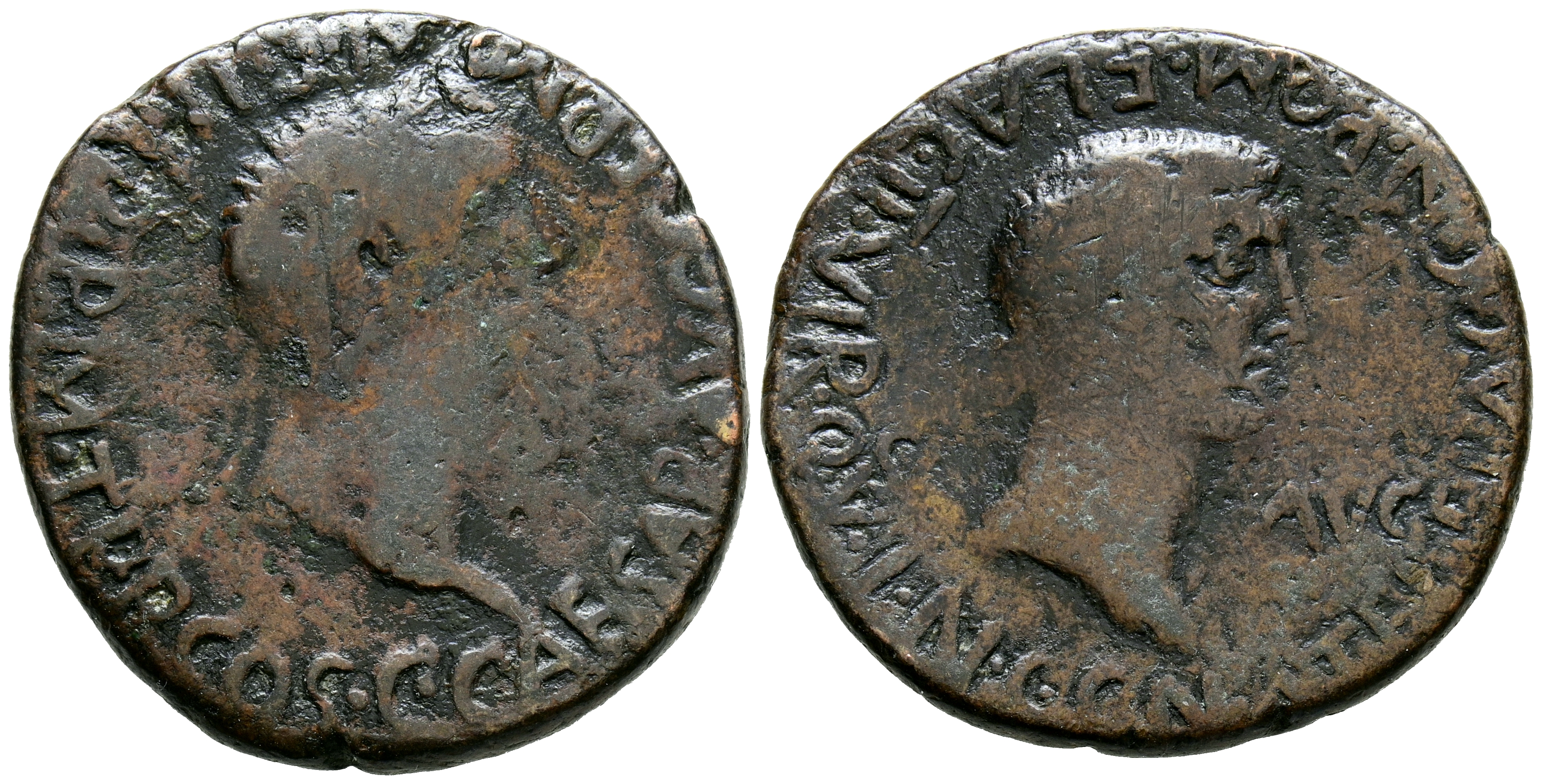 CARTAGONOVA (Cartagena, Murcia). As. (Ae. 11,20/28mm). 37-41 d.C. (FAB-613). Anv: Cabeza de Calígula laureada a derecha, alrededor leyenda: C CAESAR AVG GERMANICA IMP P M TR P COS. Rev: Cabeza laureada de Cesonia, a los lados: SAL-AVG, alrededor leyenda: CN ATEL FLAC CN POM FLAC II VIR. BC+/MBC-.