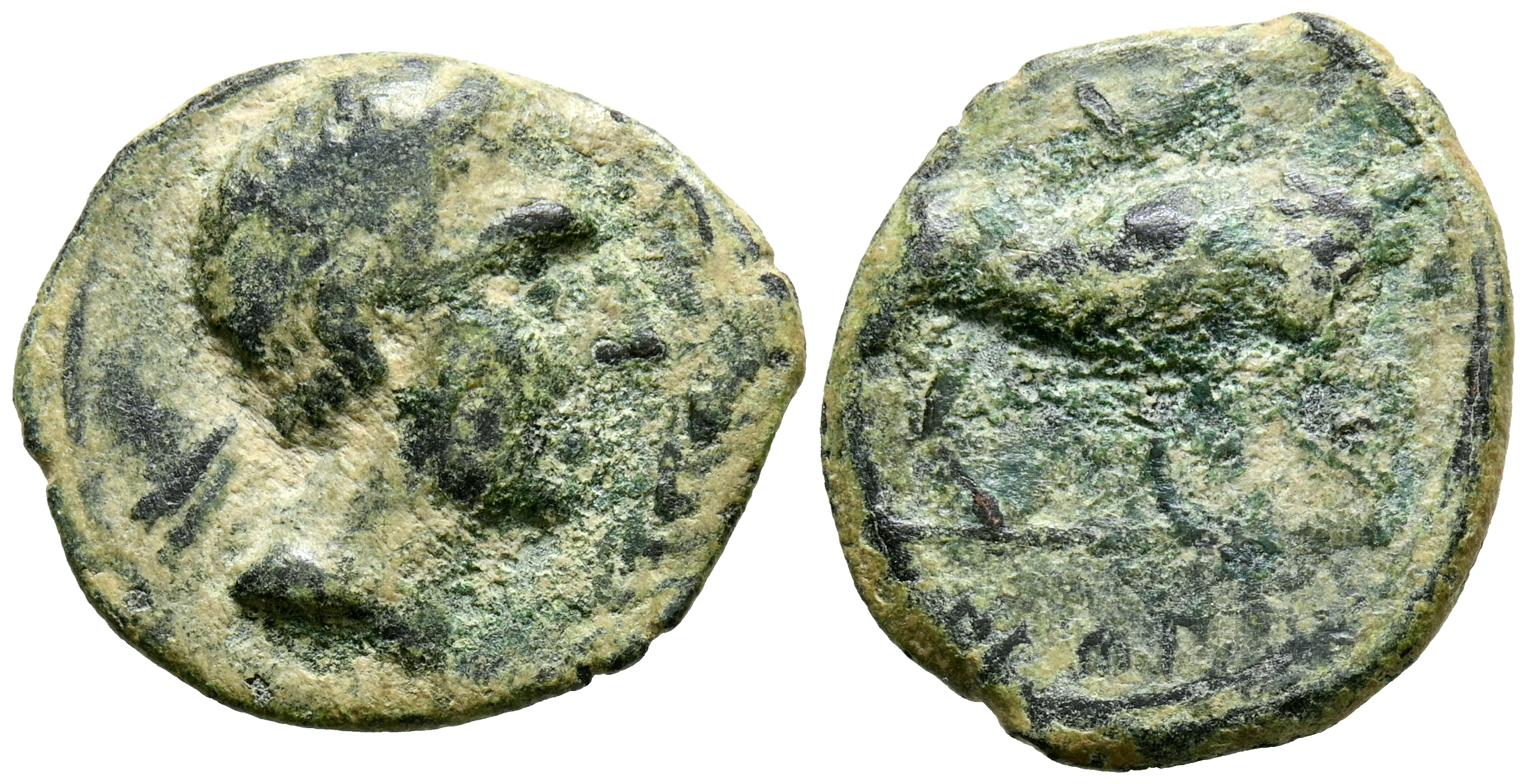 CASTULO (Cazlona, Jaén). Semis. (Ae. 4,20g/22mm). 180 a.C. (FAB-720). Anv: Cabeza masculina diademada a derecha, delante palma Rev: Toro a derecha, encima creciente, delante letra ibérica: Ca, en exergo leyenda ibérica: CaSTeLe. MBC-.