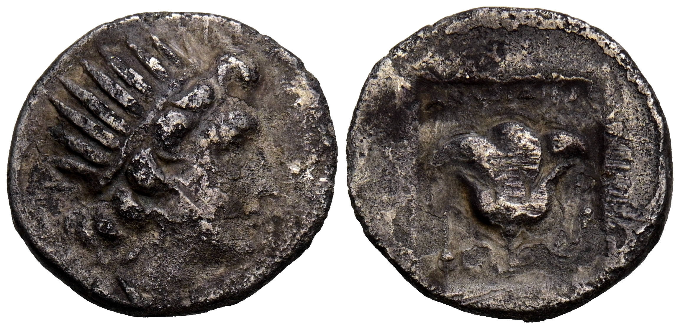 ISLAS DE CARIA, Rodas. Dracma. (Ar. 2,92g/16mm). 88-84 a.C. (HGC 6, 1461). Anv: Busto radiado a derecha de Helio. Rev: Rosa entre P-O, encima leyenda griega: NIKHΦOPOΣ. MBC+. Cospel faltado.