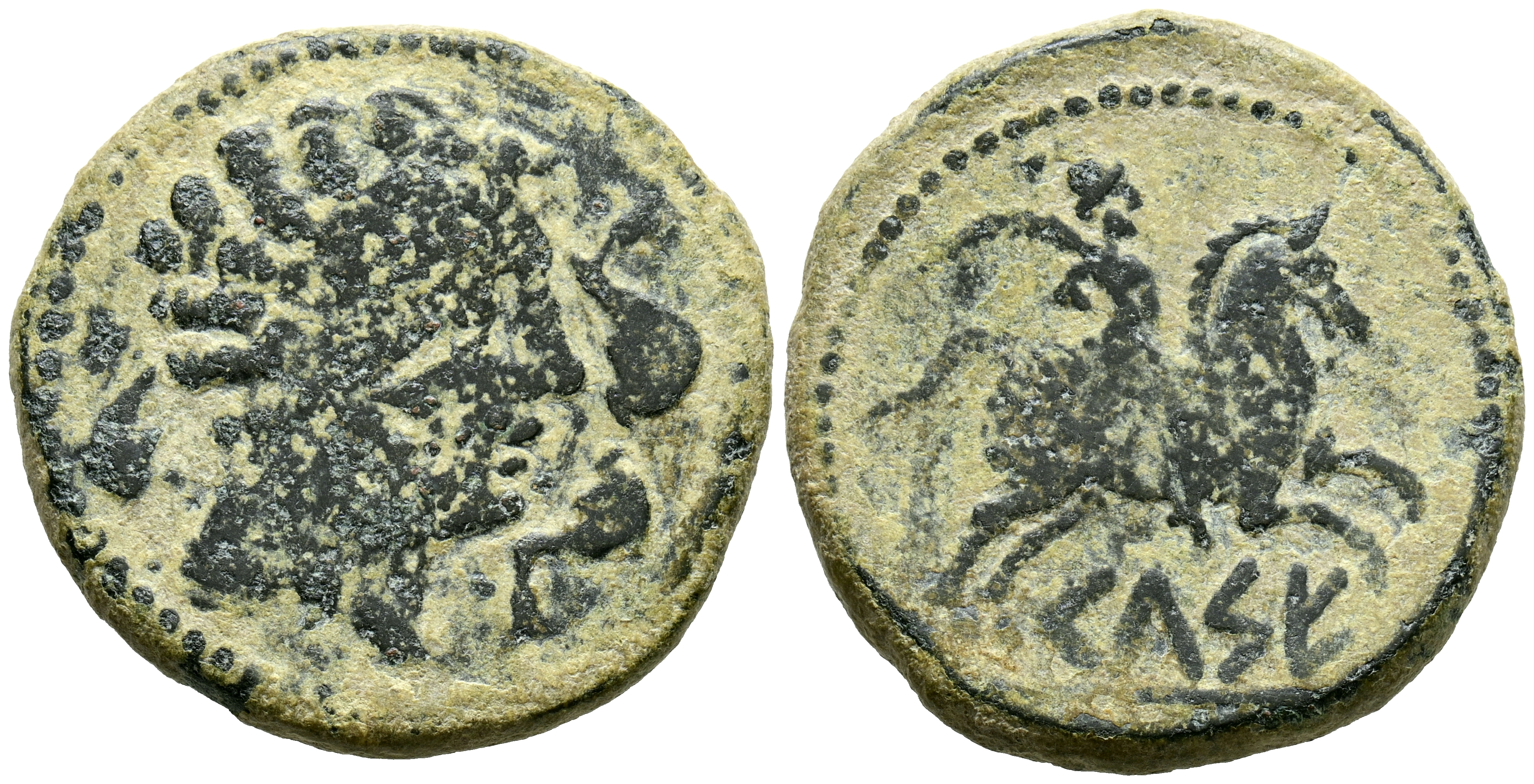 CELSE (Velilla de Ebro, Zaragoza). As. (Ae. 13,83g/29mm). 120-50 a.C. (FAB-771). Anv: Cabeza masculina a derecha con manto y fíbula, alrededor de tres delfines. Rev: Jinete con palma a derecha, debajo leyenda ibérica sobre línea: CeLSE. MBC-.
