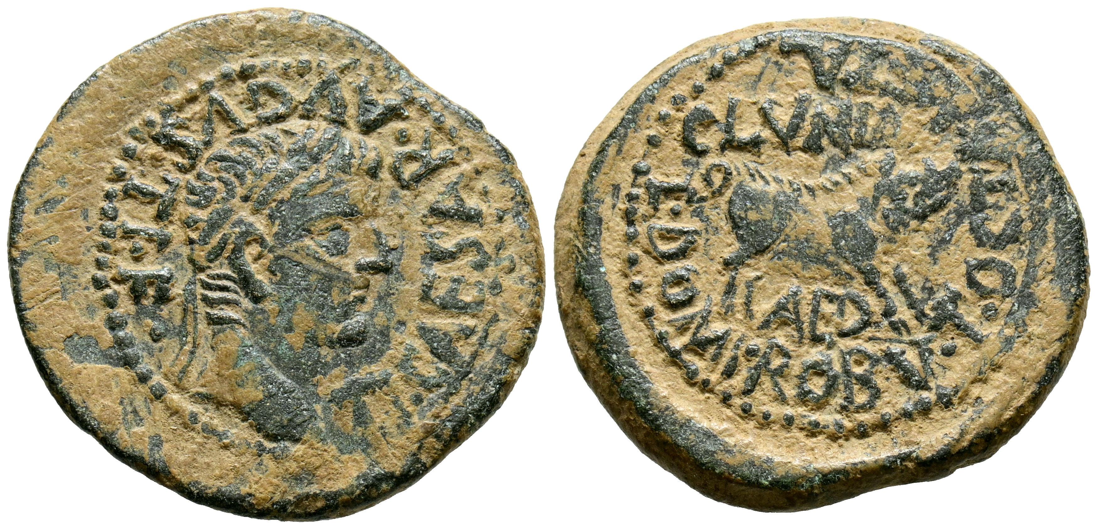 CLUNIA (Coruña del Conde, Burgos). Semis. (Ae. 7,13g/25mm). 37-41 d.C. (FAB-842). Anv: Cabeza laureada de Tiberio a derecha, alrededor leyenda: TI CAESAR AVGVSTI F. Rev. Jabalí a derecha, encima leyenda: CLVNIA, debajo: AED, alrededor leyenda: L DOMI ROBV T OCTA METAL. MBC. Escaso ejemplar.
