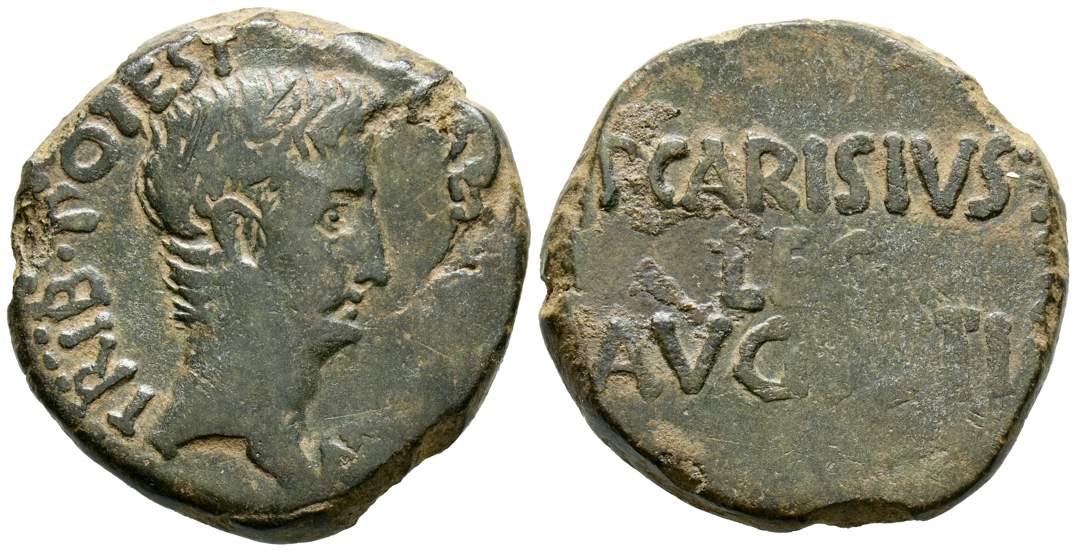 EMERITA AUGUSTA (Mérida, Badajoz). As. (Ae. 9,80g/26mm). 27 a.C. (FAB-986). Anv: Cabeza de Augusto a derecha, alrededor leyenda: CAESAR AVGVS TRIBVN POTEST. Rev: Leyenda: P CARISIVS LEG AVGVSTI. MBC/MBC-.