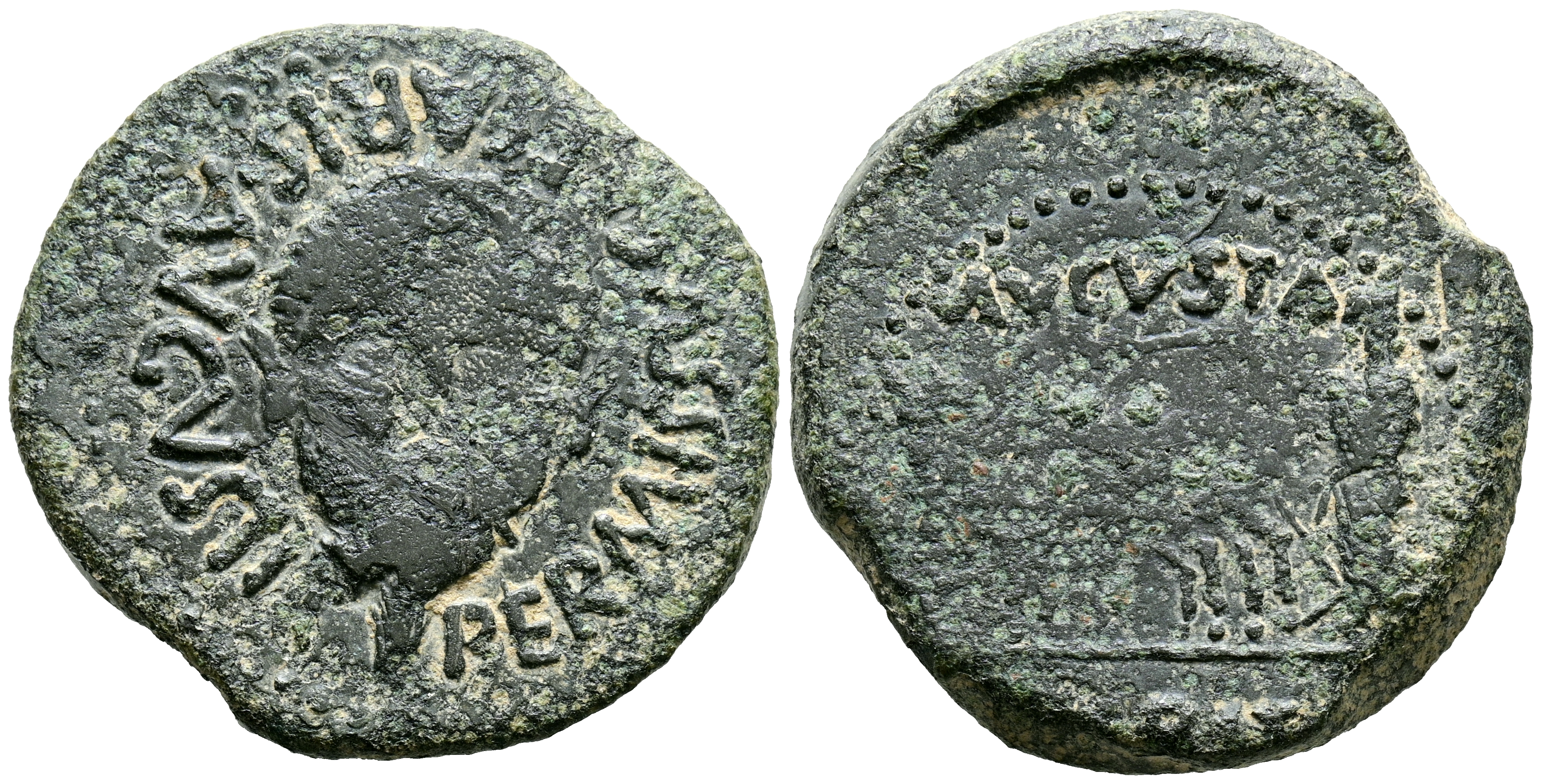EMERITA AUGUSTA (Mérida). As. (Ae. 11,43g/28mm). 22 a.C.-14 d.C. (FAB-1009). Anv: Cabeza barbada de frente, debajo ánfora, alrededor leyenda: PERMISSV CAESARIS AVGVSTI. Rev: Yunta a izquierda, encima leyenda: AVGVSTA, debajo: EMERITA. MBC-/BC+.