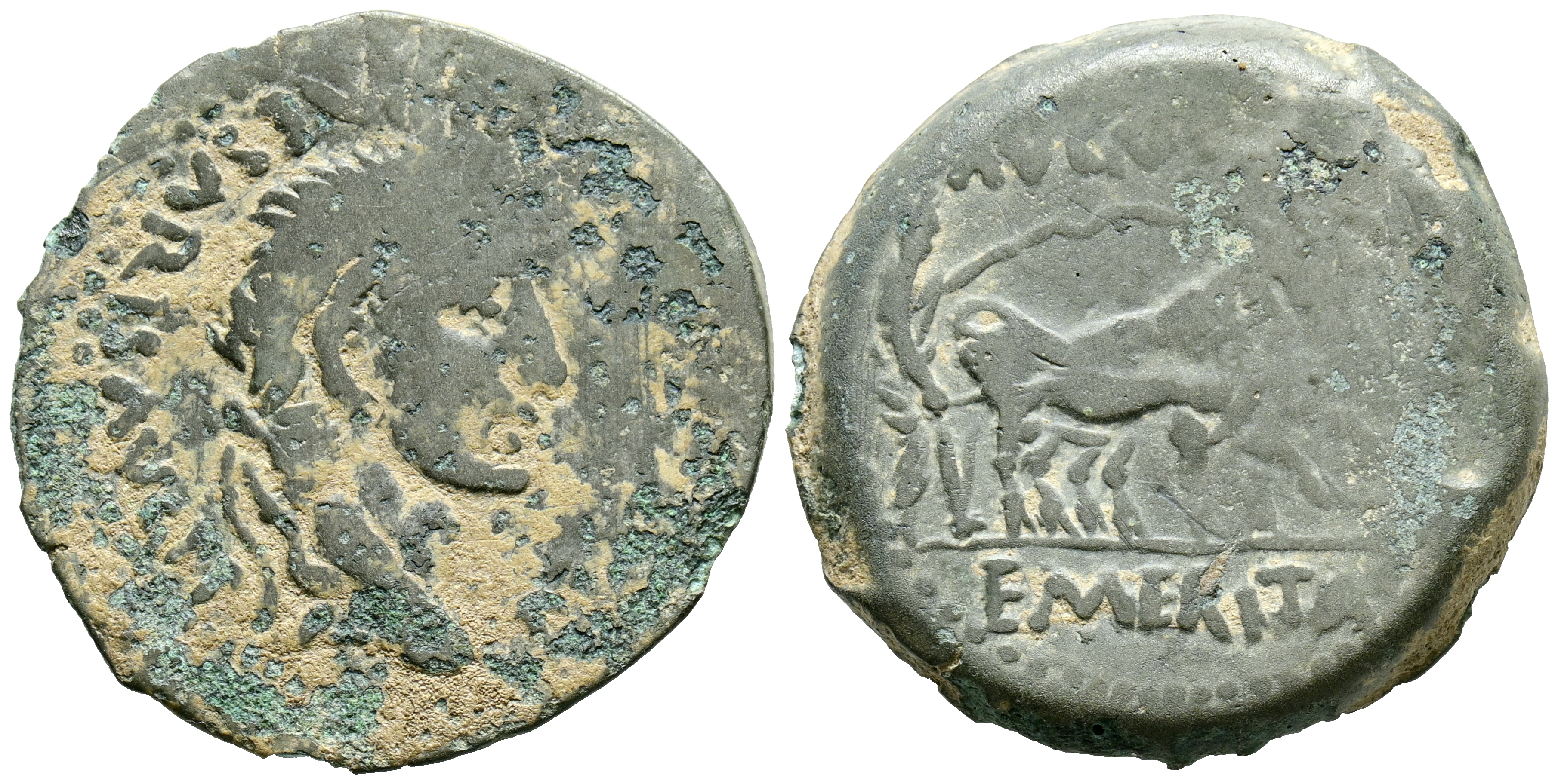 EMERITA AUGUSTA (Mérida, Badajoz). As. (Ae. 9,17g/25mm). 22 a.C.-14 d.C. (FAB-1012). Anv: Cabeza laureada de Augusto a derecha, alrededor leyenda: PERM IMP CAESARIS AVG P P. Rev: Yunta a derecha, alrededor leyenda: AVGVSTA EMERITA. MBC-.