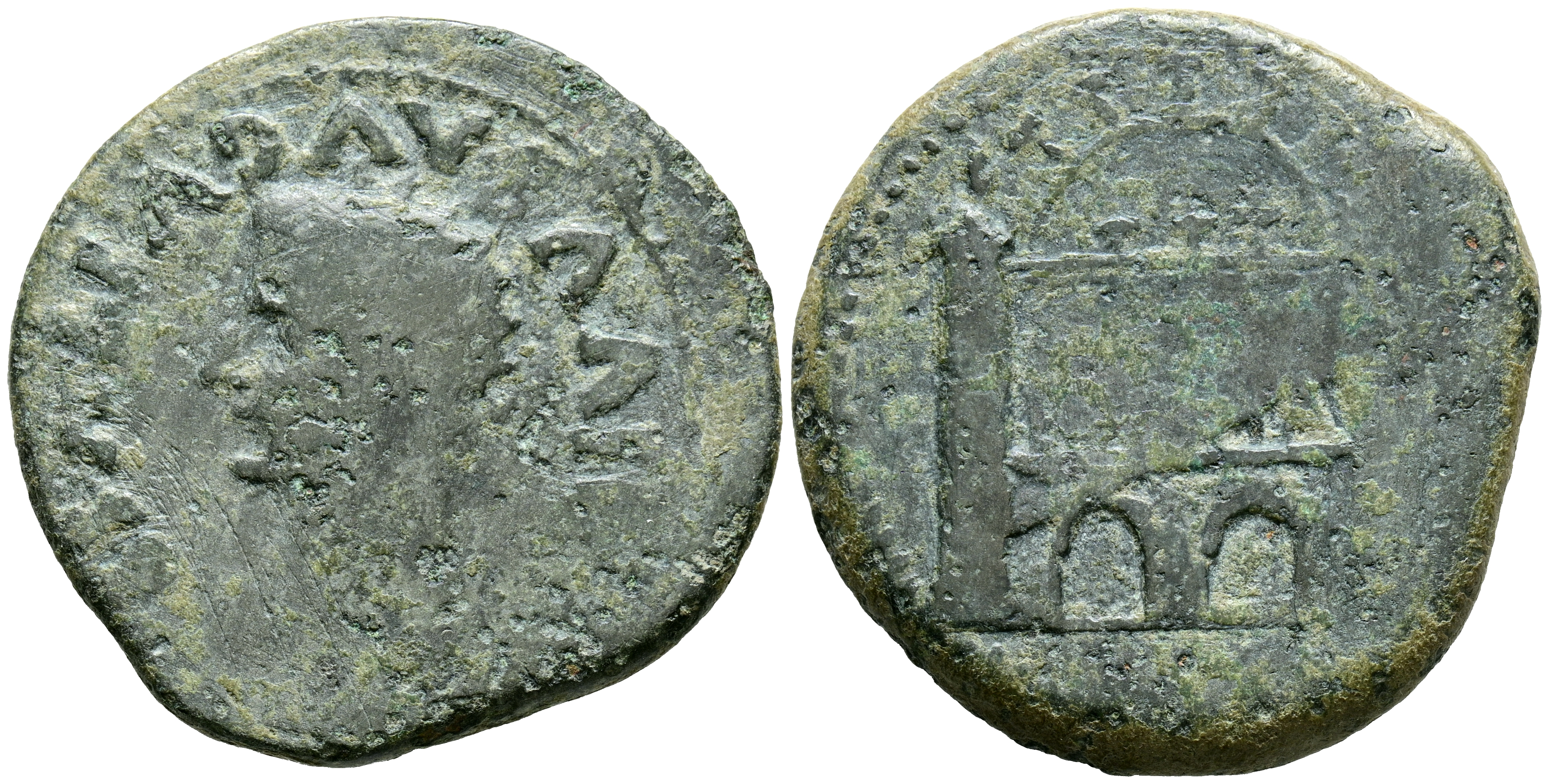 EMERITA AUGUSTA (Mérida, Badajoz). Dupondio. (Ae. 15,83g/33mm). 14-36 d.C. (FAB-1029). Anv: Cabeza radiada de Augusto a la izquierda, alrededor de la leyenda: DIVVS AVGVSTVS PAT PATRIA. Rev: Puerta con inscripción: AVGVSTA EMERITA. MBC-.