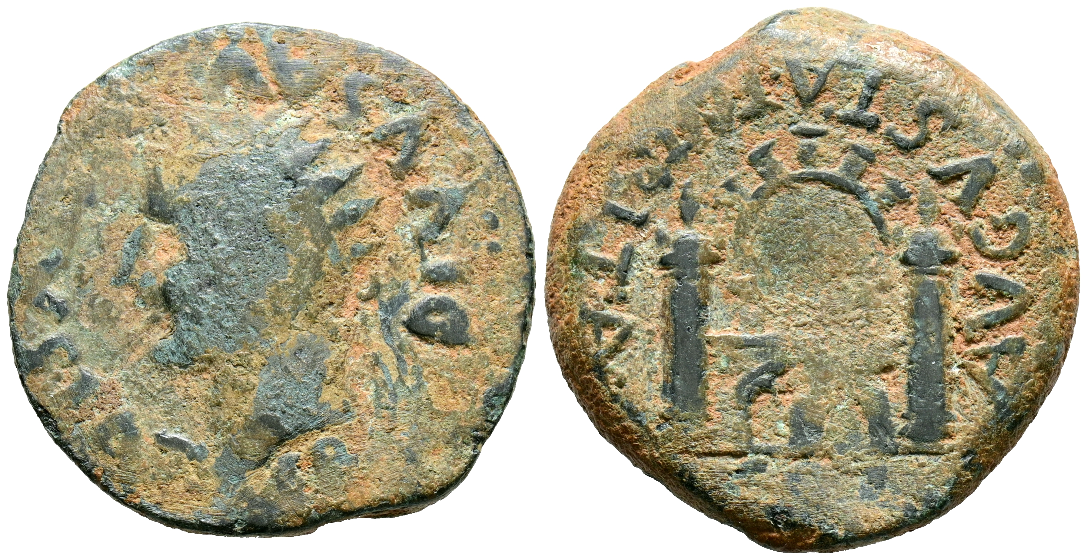 EMERITA AUGUSTA (Mérida, Badajoz). As. (Ae. 9,77g/26mm). 14-36 d.C. (FAB-1044). Anv: Busto radiado de Augusto a izquierda, alrededor leyenda de lectura externa: DIVVS AVGVSTVS PATER. Rev: Puerta, alrededor leyenda: COL AVGVSTA EMERITA. BC+.