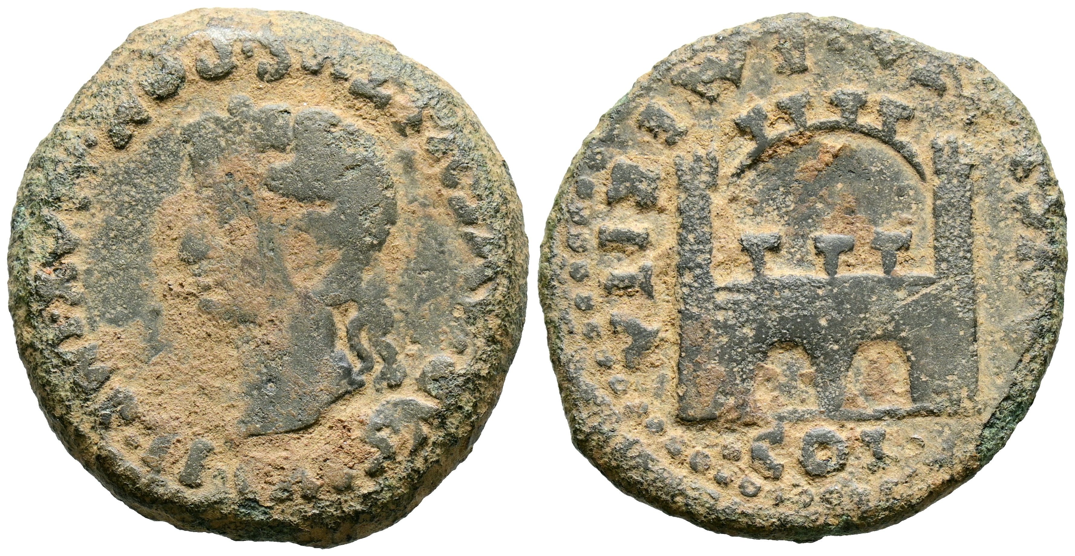EMERITA AUGUSTA (Mérida). As. (Ae. 11,67g/27mm). 14-36 d.C. (FAB-1055). Anv: Cabeza desnuda de Tiberio a izquierda, alrededor leyenda: TI CAESAR AVG PON MAX IMP. Rev: Puerta de la ciudad, alrededor leyenda: COL AVGVSTA EMERITA. MBC-/MBC.