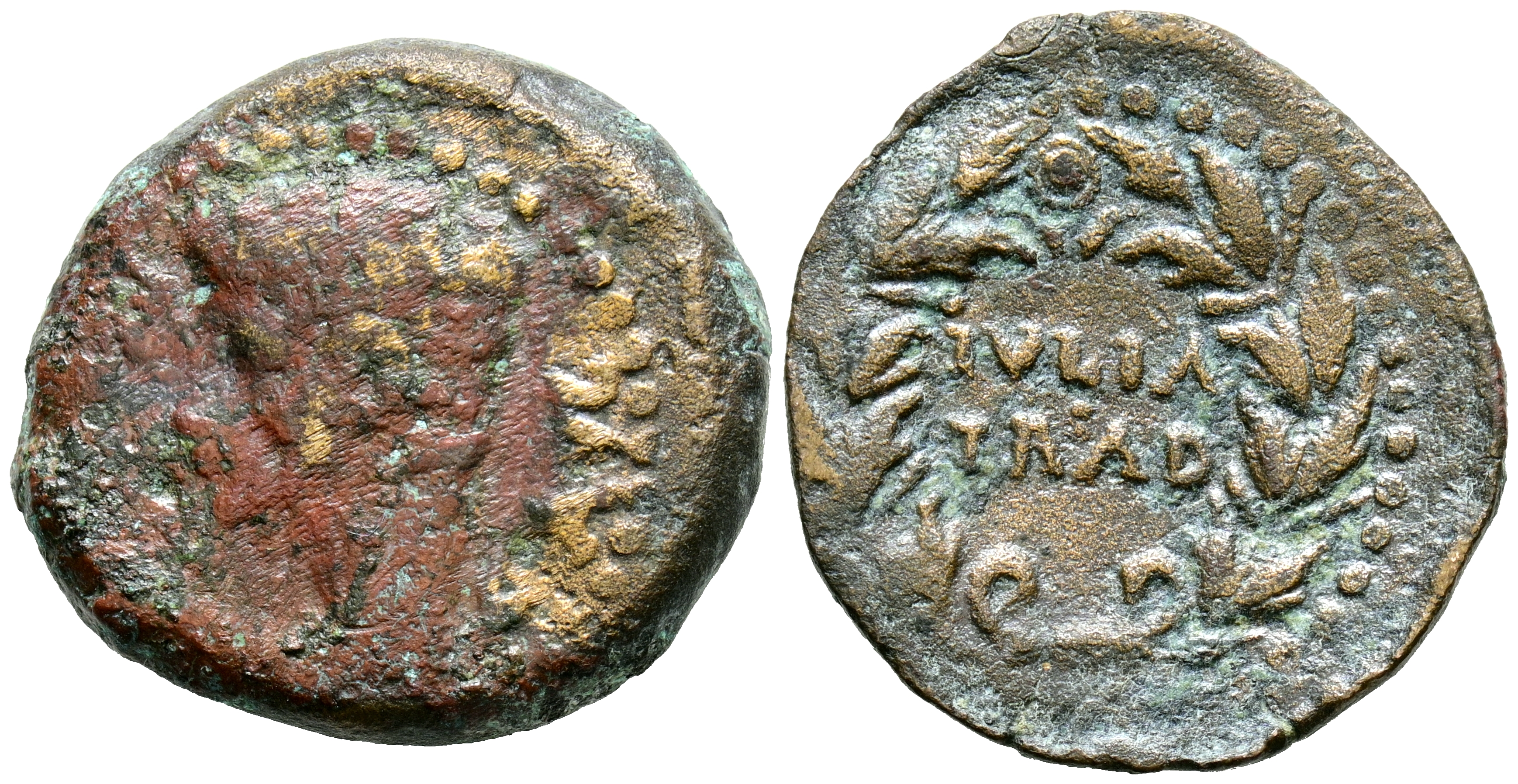 IULIA TRADUCTA (Algeciras, Cádiz). As. (Ae. 11,09g/24mm). 27 a.C.-14 d.C. (FAB-1614). Anv: Cabeza de Augusto a izquierda, alrededor leyenda: PERM CAES AVG. Rev: Leyenda: IVLIA/TRAD, dentro de corona de laurel. MBC-/MBC.