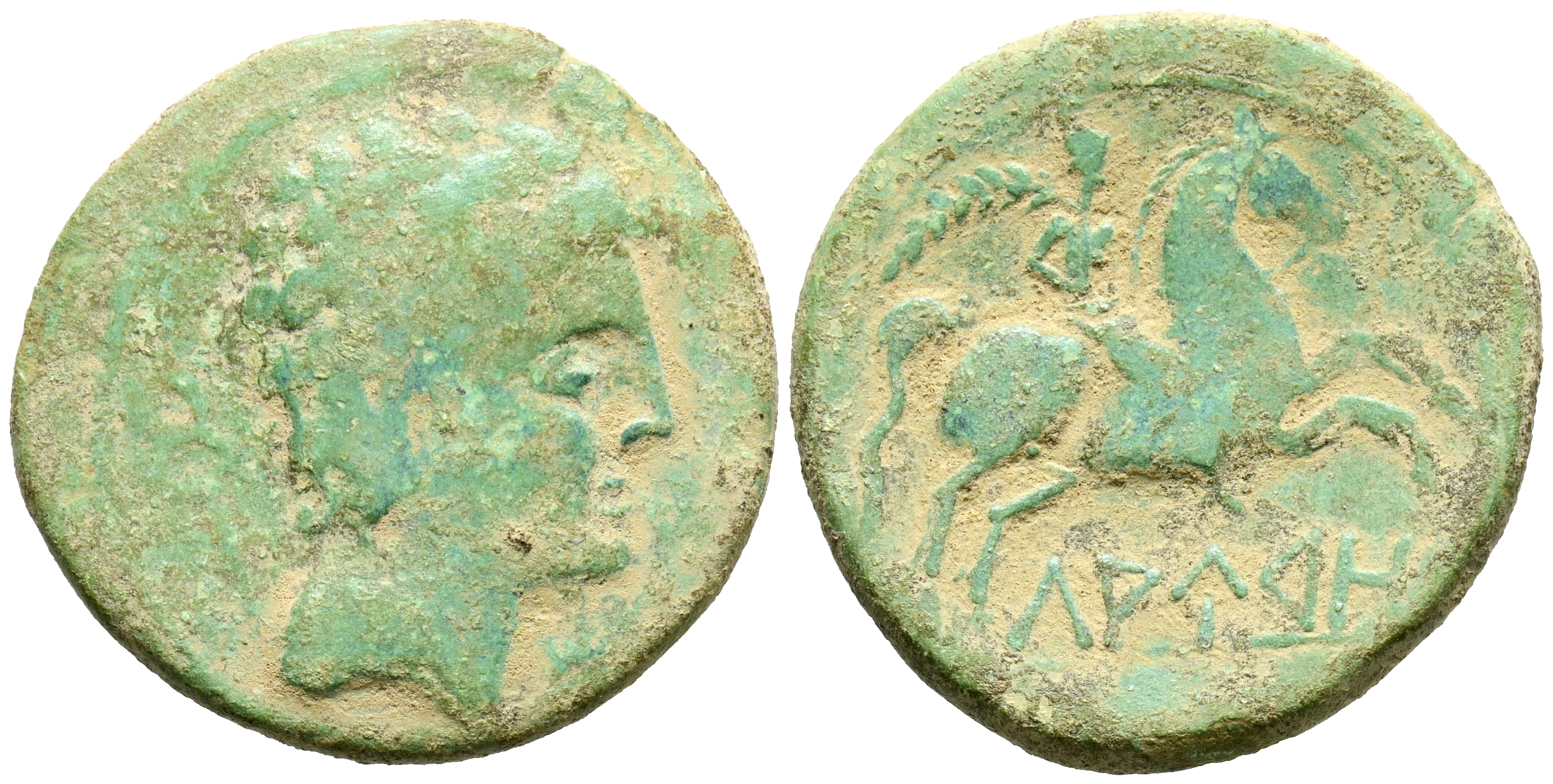 LAURO (Llerona, Barcelona). As. (Ae. 16,82 g/25,6mm). 120-20 a.C. (FAB-1682).Anv: Cabeza masculina a derecha, detrás cadúceo. Rev: Jinete con palma a derecha, debajo LAURO. MBC-. Rara.