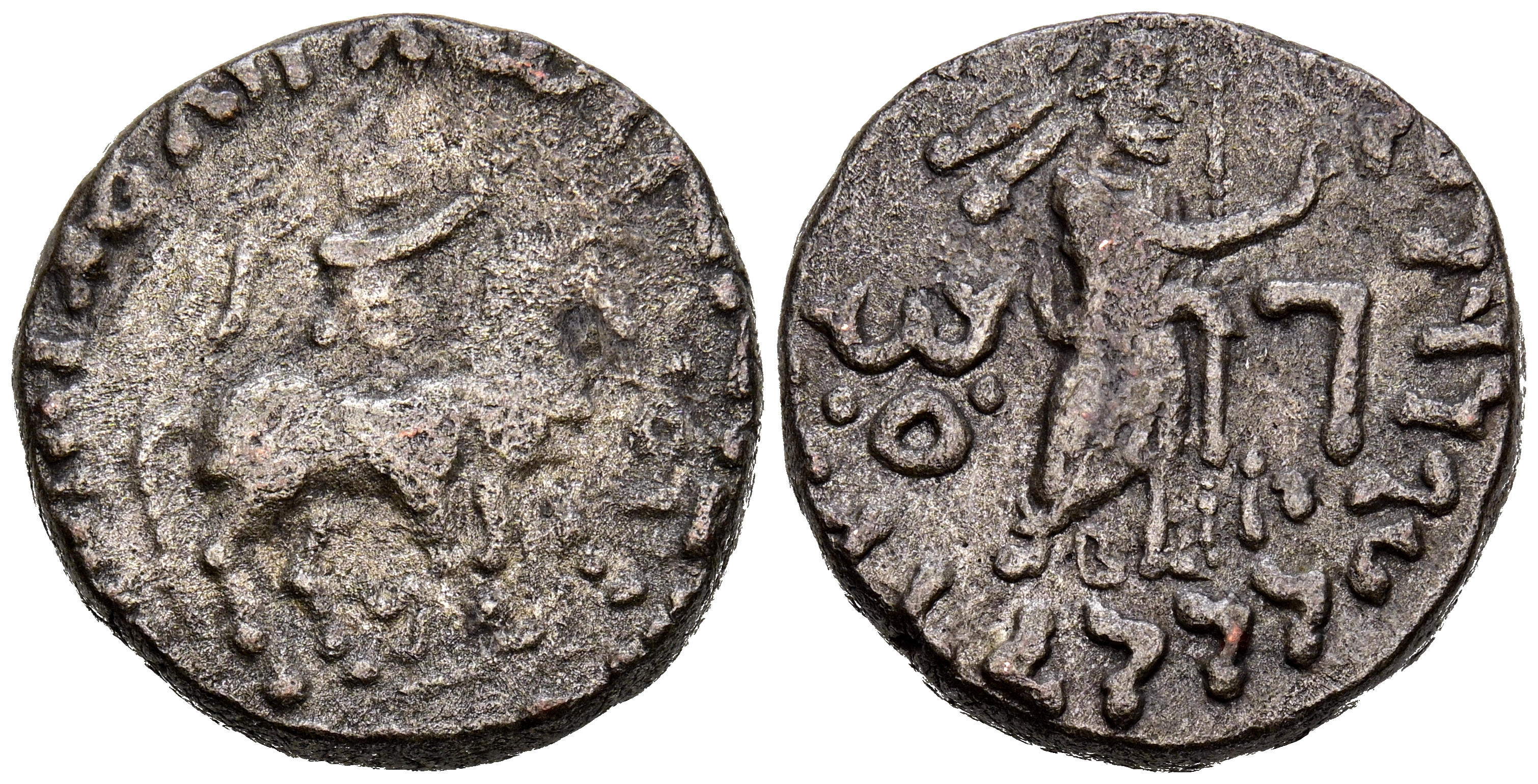 REYES INDOESCITAS, Azes I. Dracma. (Ar. 2,21g/16mm). 58-12 a.C. (HGC 6, 637). Anv: Jinete sobre caballo a derecha, delante monograma, alrededor leyenda. Rev: Atenas estante de frente con escudo y lanza, entre dos monogramas, alrededor leyenda. MBC-.