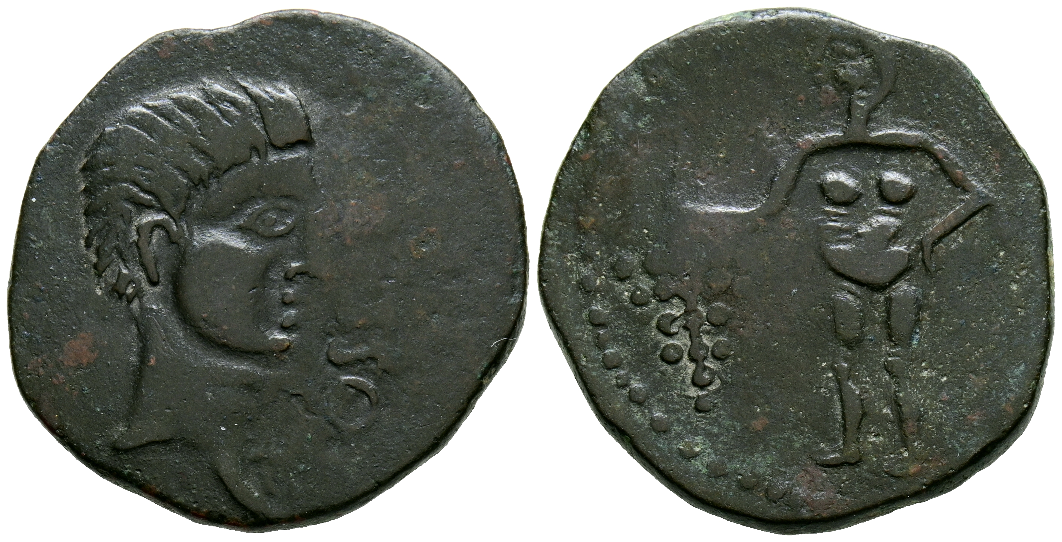 OSET (San Juan de Aznalfarache, Sevilla). As. (Ae. 9,18g/25mm). 120-20 a.C. (FAB-1949). Anv: Cabeza masculina a derecha, delante leyenda: OSSET. Rev: Genio estante a izquierda con racimo de uvas. MBC. Limpiado.