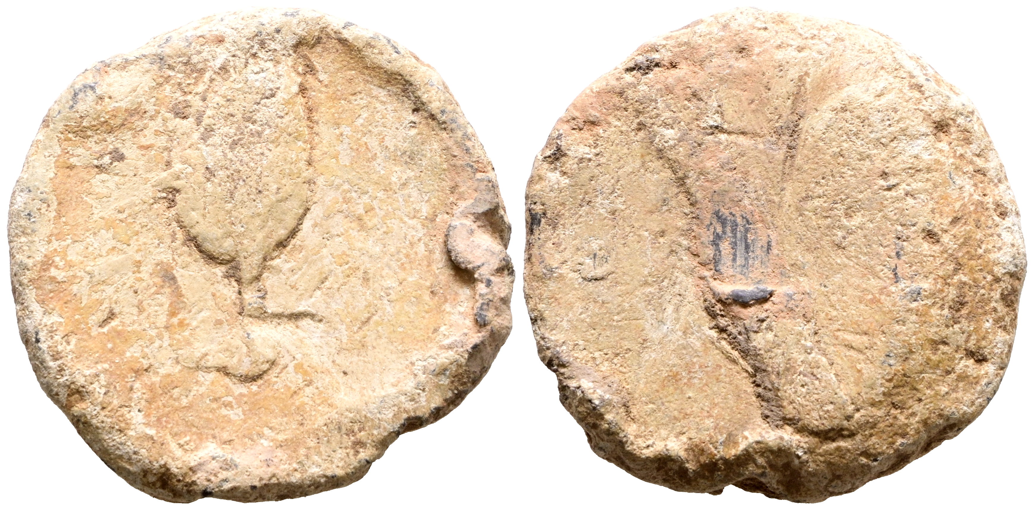 OSTUR (Zonza de Carmona, Sevilla). Plomo monetiforme. (Pb. 31,32g/32mm). 150-50 a.C. (CCP no cita). Anv: Bellota a derecha sin leyenda. Rev: Palma. MBC. Raro ejemplar, el catálogo especializado en plomos monetiformes escrito por A. Casariego, G. Cores y F. Pliego, no cita este módulo y una sola palma en el reverso.