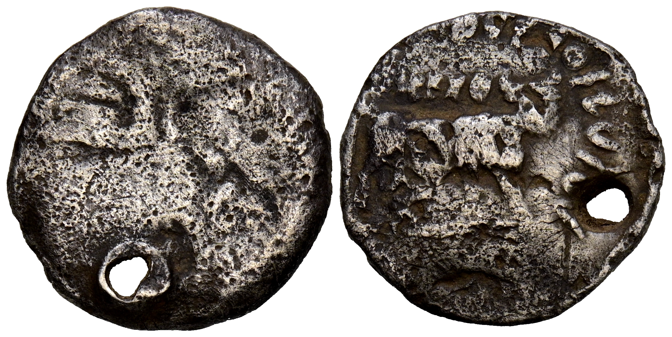 ARSE-SAGUNTO (Sagunto, Valencia). Dracma. (Ar. 2,93g/16mm). 300-200 a.C. (FAB-2040). Anv: Cabeza galeada a derecha. Rev: Toro a derecha, encima leyenda: ARSEETaR, delante leyenda: ARSBiGiSTeEGiAR. MC/BC. Perforación. Raro ejemplar.