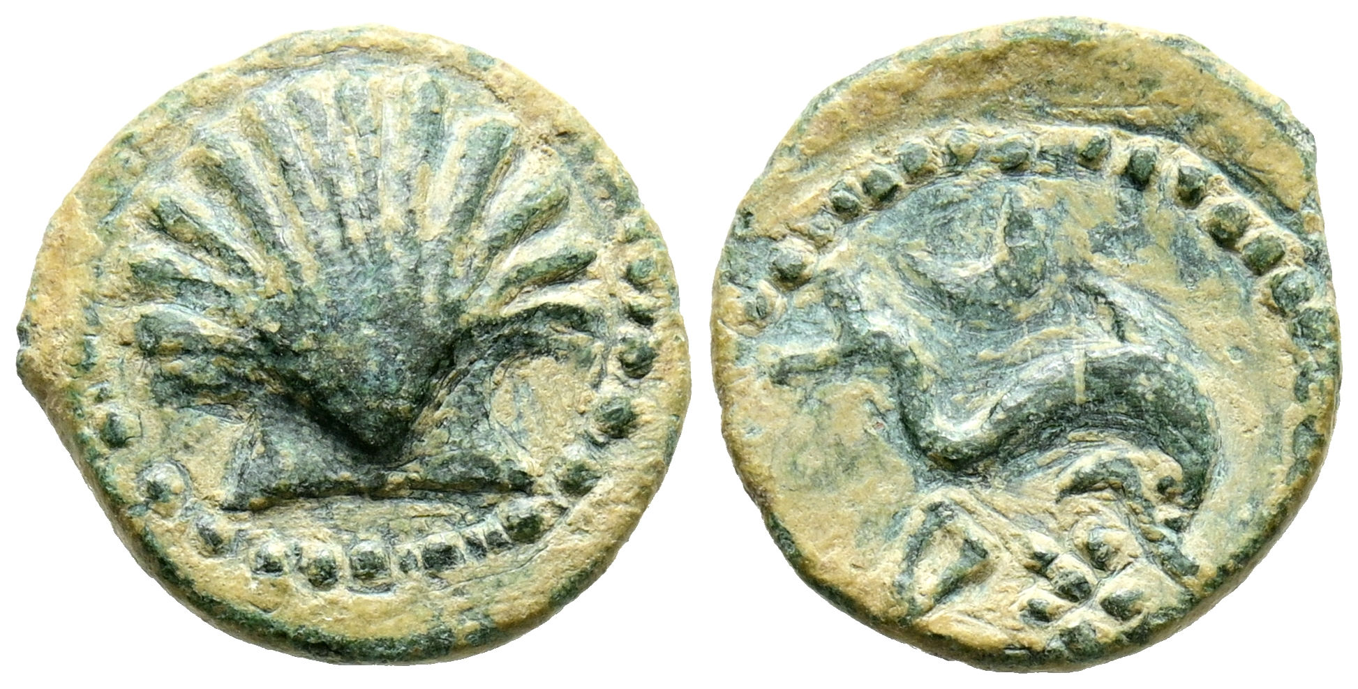 ARSE-SAGUNTO (Sagunto, Valencia). Sextante. (Ae. 1,39g/14mm). 170-20 a.C. (FAB-2064). Anv: Concha. Rev: Delfín a derecha, encima creciente, debajo letra ibérica A y estrella. MBC+.