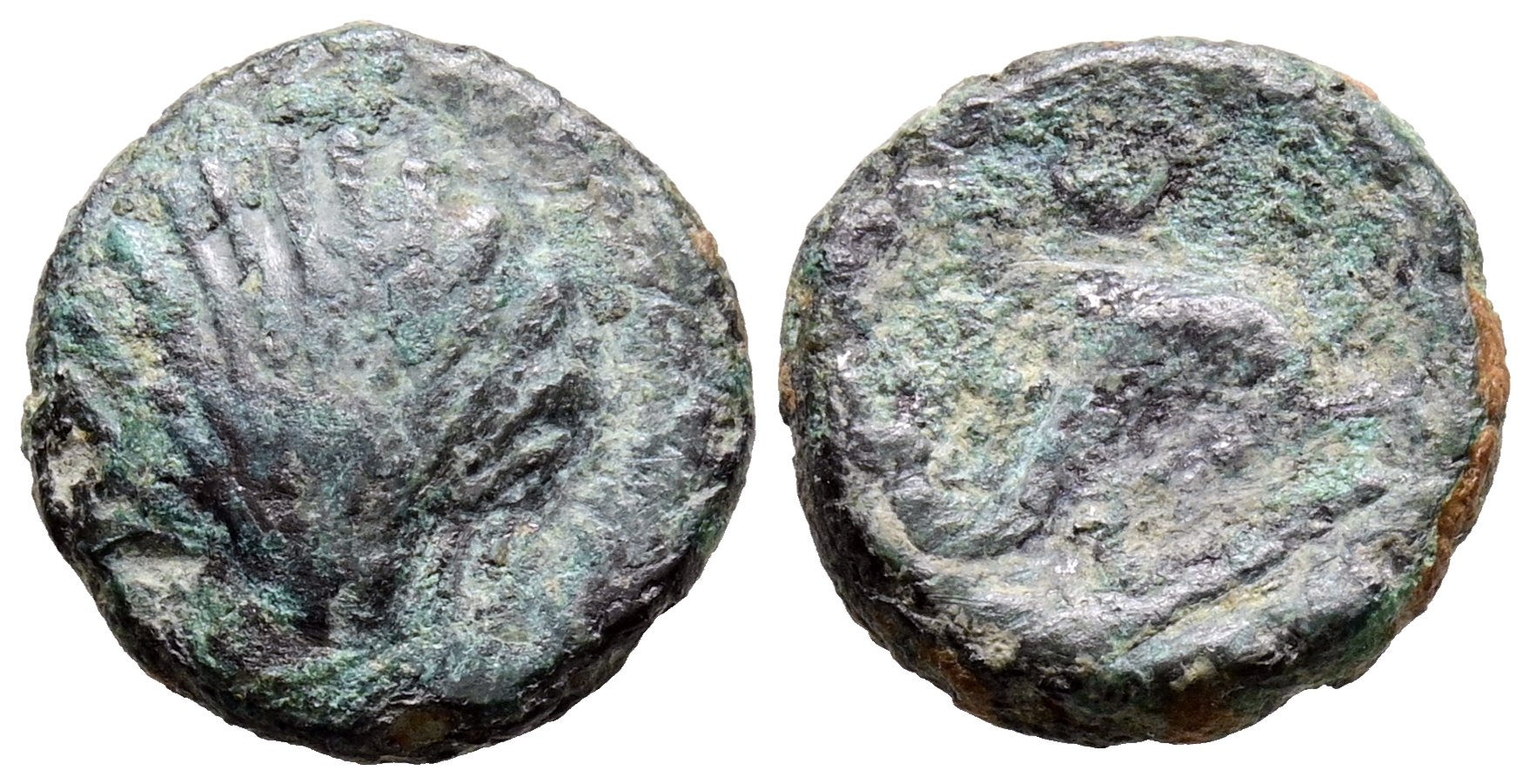 ARSE-SAGUNTO (Sagunto, Valencia). Sextante. (Ae. 1,44g/12mm). 170-20 a.C. (FAB no cita; ACIP 1981, catalogado como R6). Anv: Concha. Rev: Delfín a derecha, encima creciente, debajo mazo. MBC-. Muy escaso.
