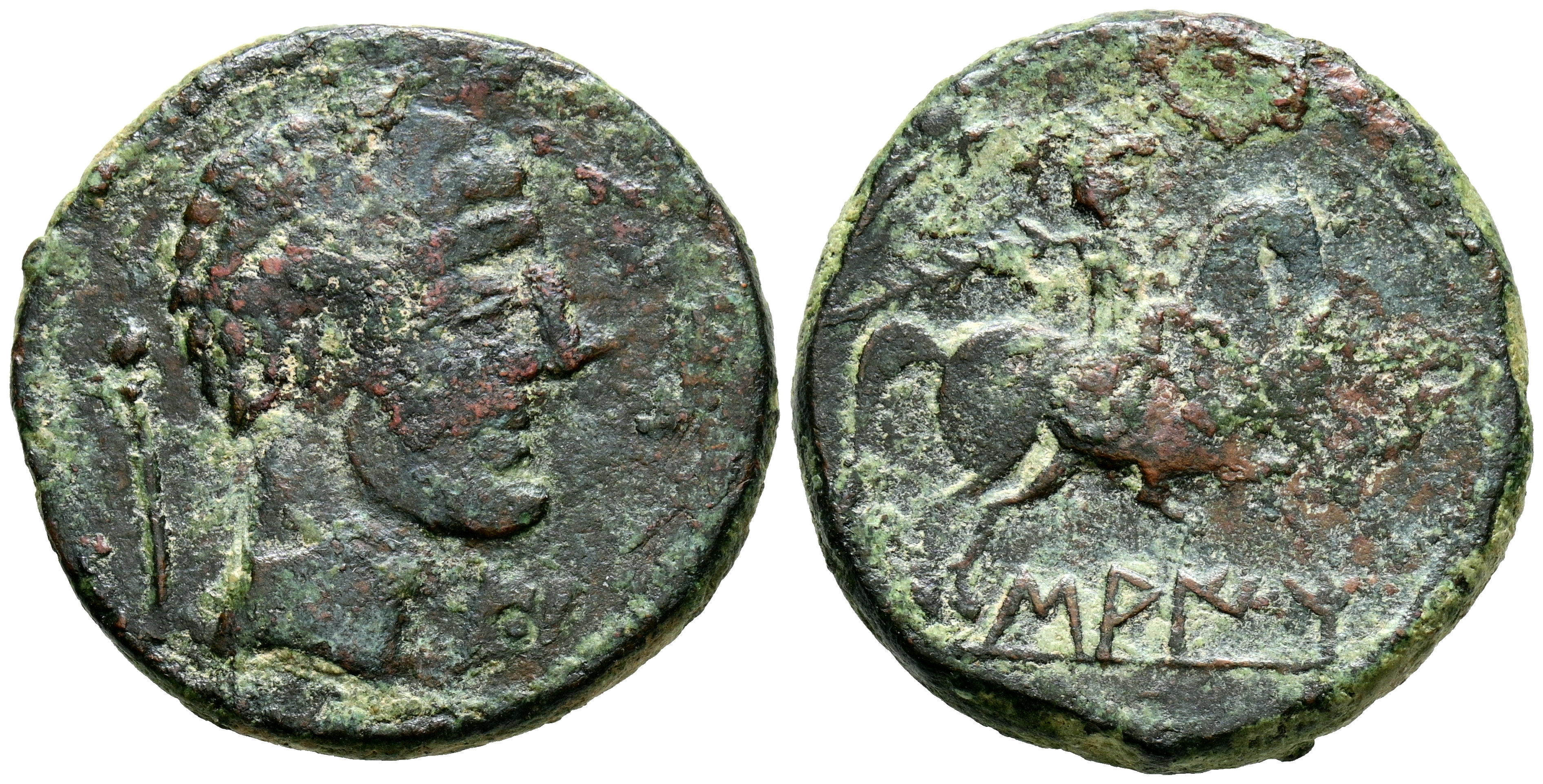 SAITI (Xátiva, Valencia). As. (Ae. 12,20g/26mm). 120-20 a.C. (FAB-2099). Anv: Cabeza masculina a derecha, detrás cetro, delante letras ibericas E y Ba. Rev: Jinete con palma a derecha, debajo leyenda ibérica: SAITi. MBC-.