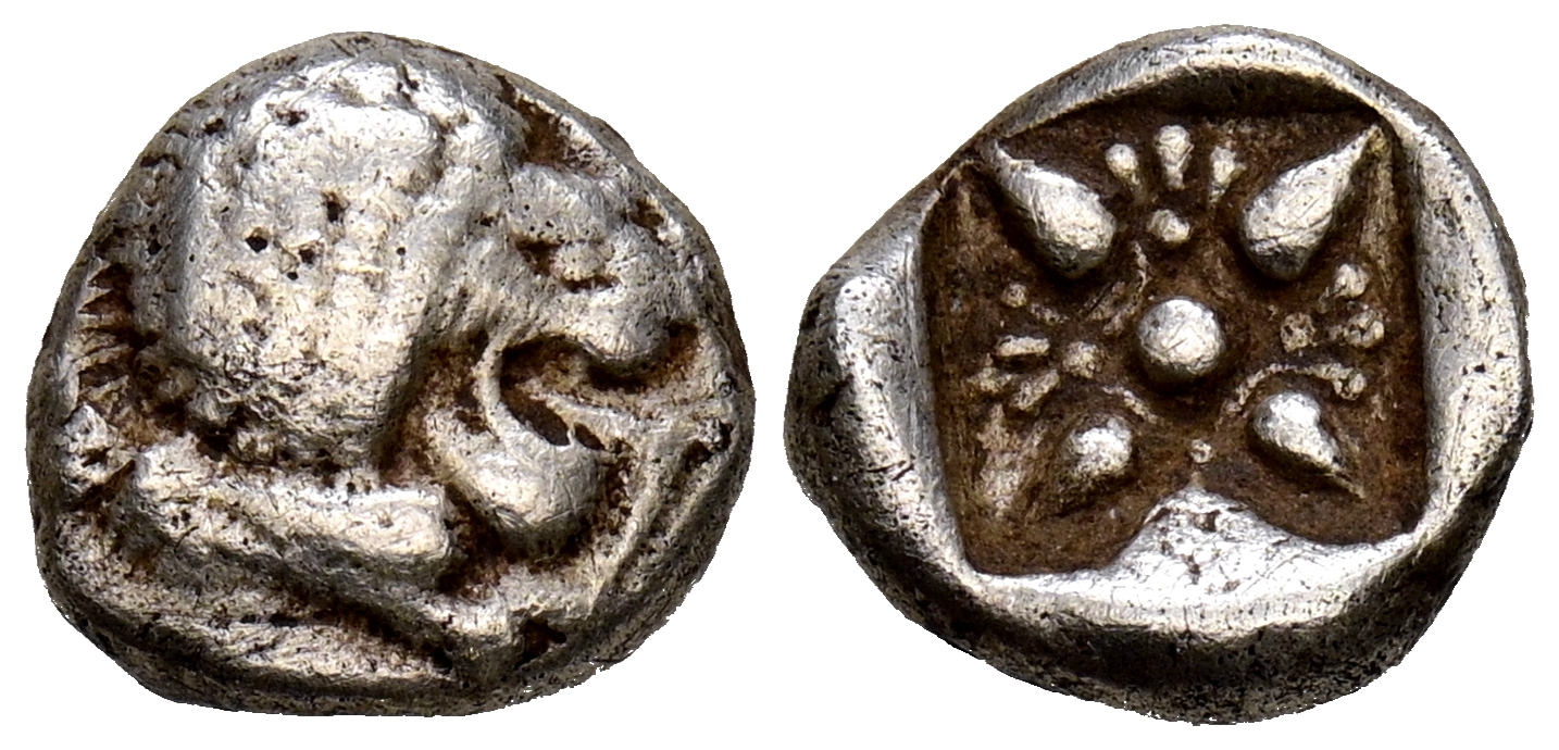 JONIA, Miletos. Dióbolo. (Ar. 1,15g/10mm). 600-500 a.C. (SNG Von Aulock 2080). Anv: Cabeza de leon a derecha. Rev: Diseño estrellado incuso. MBC.
