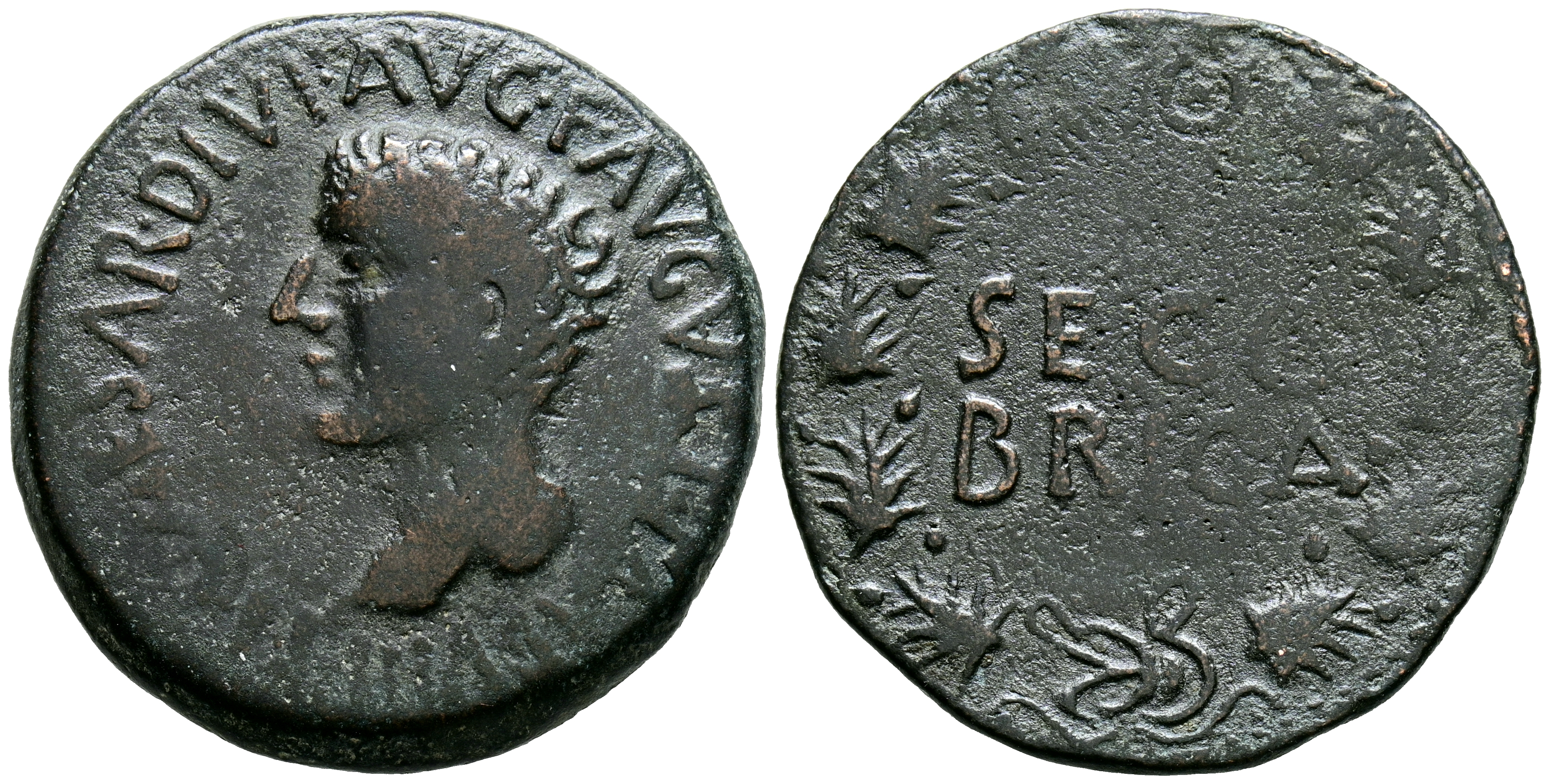 SEGOBRIGA (Saelices, Cuenca). As. (Ae. 10,68g/29mm). 14-36 d.C. (FAB-2188). Anv: Cabeza de Tiberio a izquierda, alrededor leyenda: TI CAESAR DIVI AVG F AVGVS F IMP VIII. Rev: Leyenda: SEGO/BRIGA, dentro de láurea. MBC-. Retocado mecánicamente.