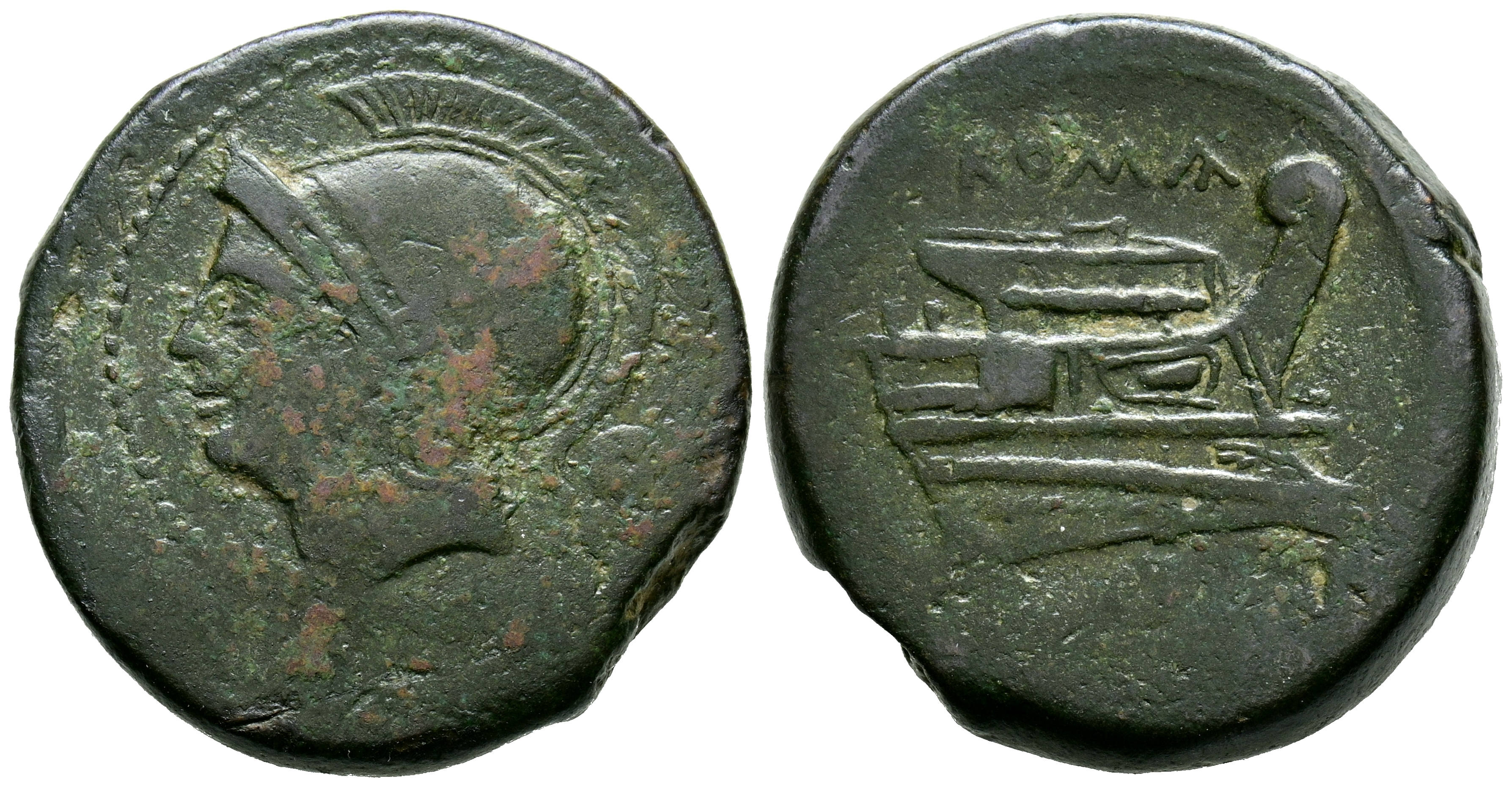 ACUÑACIONES ANONIMAS. Uncia. (Ae. 13,03g/26mm). 217-215 a.C. Roma. (Crawford 38/6). Anv: Cabeza de Roma a izquierda, detrás punto. Rev: Proa a derecha, encima leyenda: ROMA, debajo punto. MBC-.