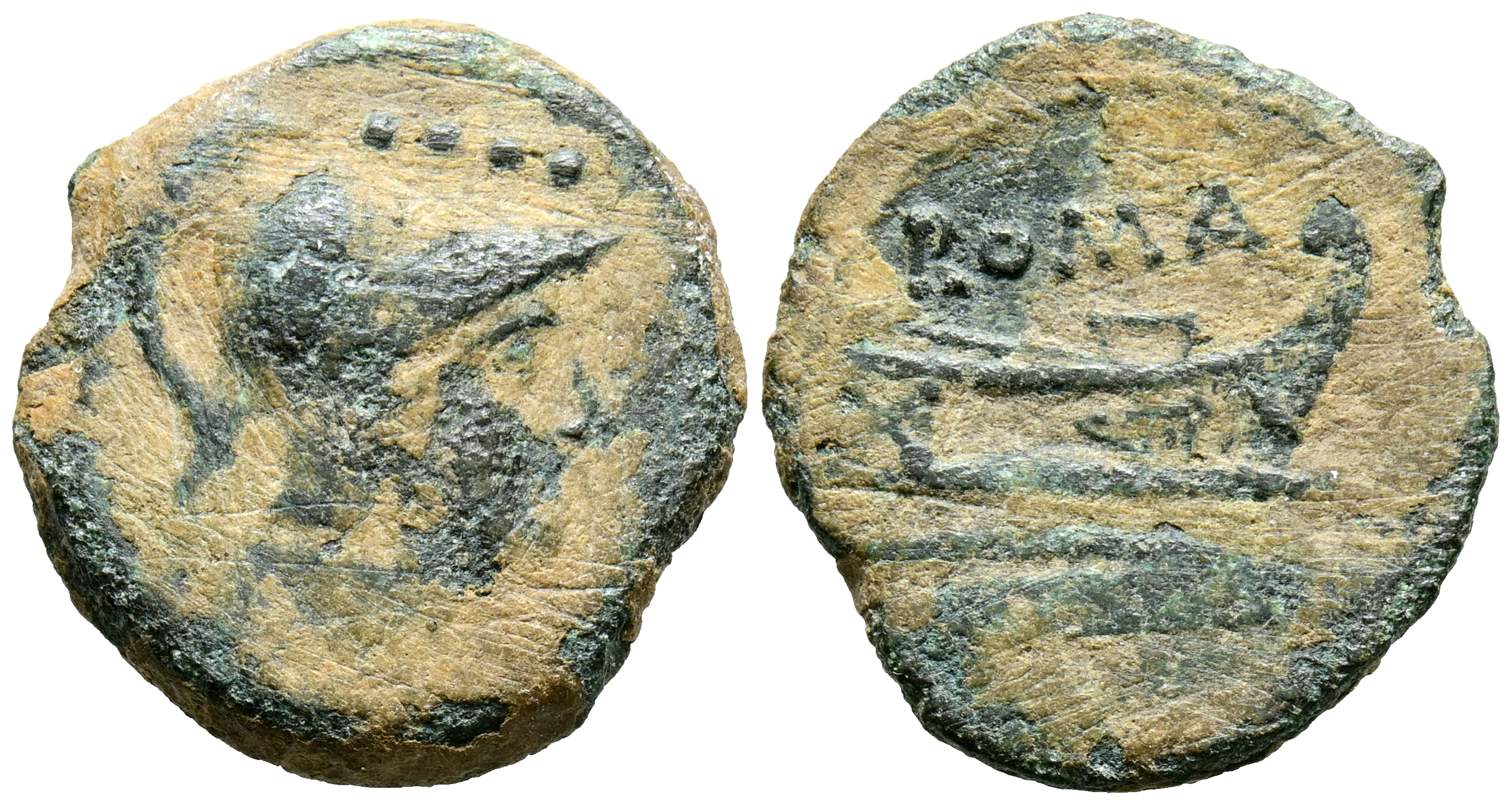 ACUÑACIONES ANONIMAS. Triente. (Ae. 4,26g/21mm). 215-212 a.C. Roma. (Crawford 56/4). Anv: Cabeza de Roma a derecha, encima cuatro puntos. Rev: Proa a derecha, encima leyenda: ROMA, debajo de cuatro puntos. MBC-.